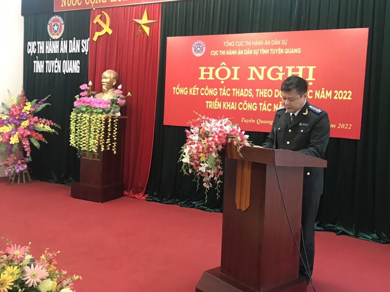 Theo báo cáo do lãnh đạo Văn phòng Cục trình bày tại Hội nghị, năm 2022, là năm thứ hai thực hiện Nghị quyết Đại hội đại biểu toàn quốc lần thứ XIII của Đảng, Nghị quyết Đại hội đại biểu Đảng bộ tỉnh lần thứ XVII. Trước bối cảnh tình hình kinh tế - xã hội cả nước nói chung, của Tuyên Quang nói riêng còn gặp nhiều khó khăn, đặc biệt là những tháng đầu năm bị tác động nghiêm trọng bởi đại dịch Covid-19, ảnh hưởng không nhỏ tới hiệu quả công tác thi hành án dân sự (THADS), nhưng với sự đoàn kết, thống nhất, quyết tâm cao, Cục Thi hành án dân sự tỉnh Tuyên Quang và các Chi cục Thi hành án dân sự trực thuộc đã bám sát các nghị quyết, chỉ thị của Đảng, Nhà nước, sự lãnh đạo, chỉ đạo của Bộ Tư pháp, Tổng cục Thi hành án dân sự, của cấp uỷ và chính quyền địa phương, chủ động xây dựng và triển khai thực hiện các chương trình, kế hoạch công tác của ngành, của đơn vị và thực hiện đồng bộ các giải pháp nên năm 2022 đã hoàn thành các chỉ tiêu, nhiệm vụ được Bộ Tư pháp, Tổng cục THADS và cấp uỷ, chính quyền địa phương giao. Kết quả thi hành án dân sự toàn tỉnh thực hiện đạt và vượt các chỉ tiêu về việc và tiền được giao, cụ thể: đã giải quyết xong: 3.751 việc, giảm 437 việc (10,4%) so với cùng kỳ năm 2021, đạt tỷ lệ 87,91% (tăng 0,13% so với cùng kỳ năm 2021, vượt 5,41% so với chỉ tiêu được Tổng cục giao); Số tiền thi hành xong 68.082.371.000 đồng, tăng 10.059.749.000 đồng (17,33%) so với cùng kỳ năm 2021, đạt tỷ lệ 62,37% (tăng 4,73% so với cùng kỳ năm 2021, vượt 20,27% so với chỉ tiêu được Tổng cục giao).