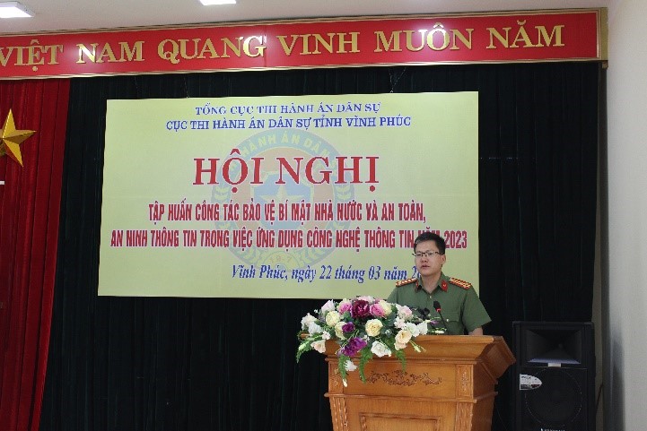 Ngày 22/3/2023, Cục Thi hành án dân sự (THADS) Vĩnh Phúc tổ chức Hội nghị tập huấn công tác bảo vệ bí mật nhà nước và an toàn, an ninh thông tin trong việc ứng dụng công nghệ thông tin, Cục THADS Vĩnh Phúc đã mời đồng chí Thượng tá Nguyễn Trường Thanh – Phó trưởng phòng An ninh chính trị nội bộ, Công an tỉnh Vĩnh Phúc là Báo cáo viên có nhiều kinh nghiệm thực tiễn trong công tác bảo vệ bí mật nhà nước và an ninh thông tin mạng về truyền đạt nội dung cho Hội nghị tập huấn.