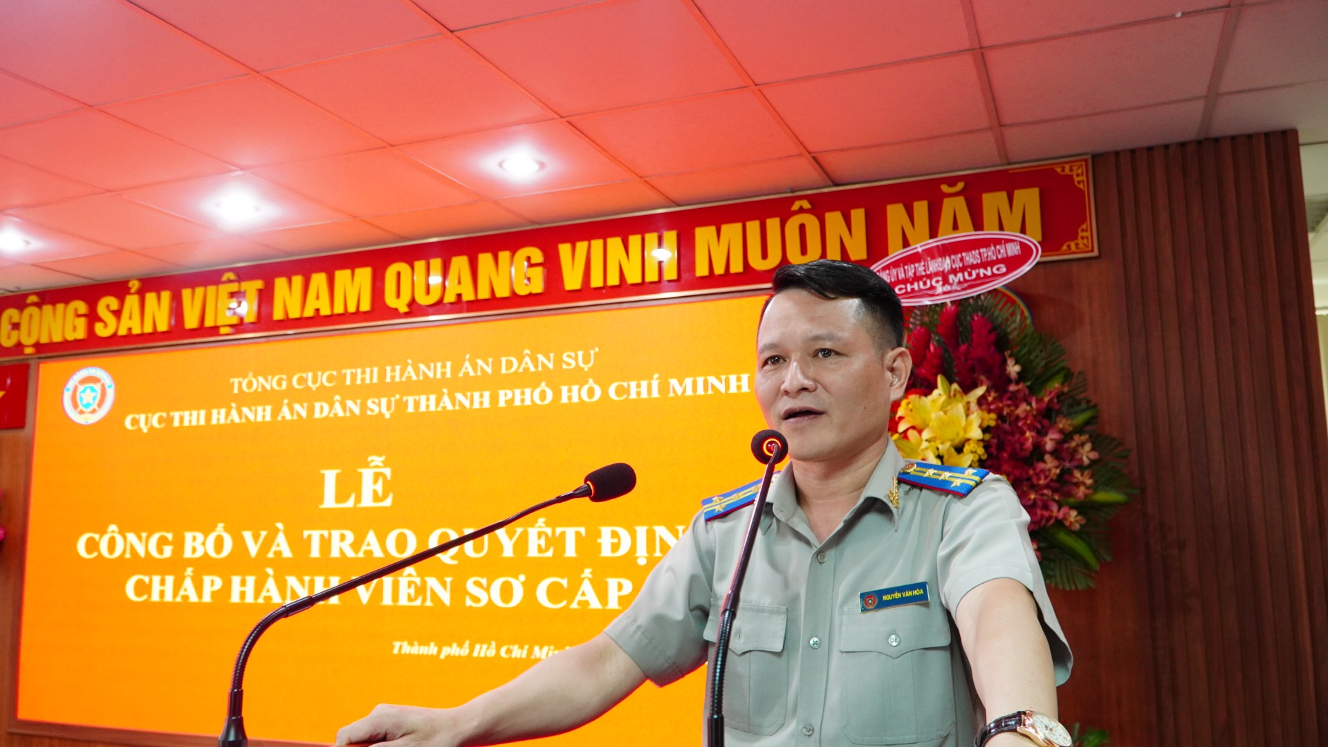 Thay mặt cho Đảng uỷ, Ban lãnh đạo, Cục trưởng Nguyễn Văn Hòa gửi lời chúc mừng tới các tân Chấp hành viên sơ cấp, đồng chí ghi nhận những nỗ lực của 39 tân chấp hành viên trong thời gian qua đã trải qua kỳ thi Chấp hành viên, xuất sắc vượt qua các công chức của Đoàn Thành phố Hồ Chí Minh thi cùng đợt, đó là một kết quả đáng mừng và với trọng trách mới, Cục trưởng mong muốn các đồng chí tiếp tục trau dồi phẩm chất đạo đức và trình độ chuyên môn, không ngừng nâng cao trình độ để đáp ứng nhu cầu công việc hiện nay, có học hỏi kinh nghiệm công tác của các Chấp hành viên đi trước để bồi dưỡng, tích lũy thêm kinh nghiệm làm cẩm nang trong quá trình thực thi nhiệm vụ.