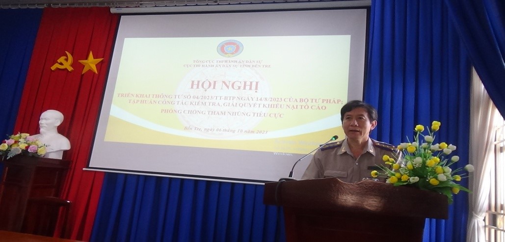 Ngày 06 tháng 10 năm 2023, Cục Thi hành án dân sự tỉnh Bến Tre tổ chức hội nghị triển khai Thông tư số 04/2023/TT-BTP ngày 14 tháng 8 năm của Bộ Tư pháp về việc hướng dẫn một số thủ tục về quản lý hành chính và biểu mẫu nghiệp vụ trong thi hành án dân sự. Tham dự hội nghị tập huấn có toàn thể Chấp hành viên, Thẩm tra viên,Thư ký và Chuyên viên của các cơ quan Thi hành án dân sự trên địa bàn tỉnh. Ông Nguyễn Văn Nghiệp, Cục trưởng dự chủ trì hội nghị.