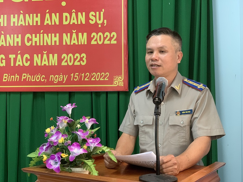 Chiều ngày 15/12/2022, Cục Thi hành án dân sự tỉnh Bình Phước đã tổ chức hội nghị tổng kết công tác thi hành án dân sự, theo dõi thi hành án hành chính năm 2022 và triển khai công tác năm 2023. Tỉnh ủy viên, Phó Chủ tịch UBND tỉnh Trần Văn Mi; đại diện lãnh đạo Tổng cục Thi hành án dân sự có đồng chí Trần Thị Phương Hoa; lãnh đạo một số sở, ngành và Chi cục Thi hành án dân sự các huyện, thị xã, thành phố trong tỉnh dự hội nghị.