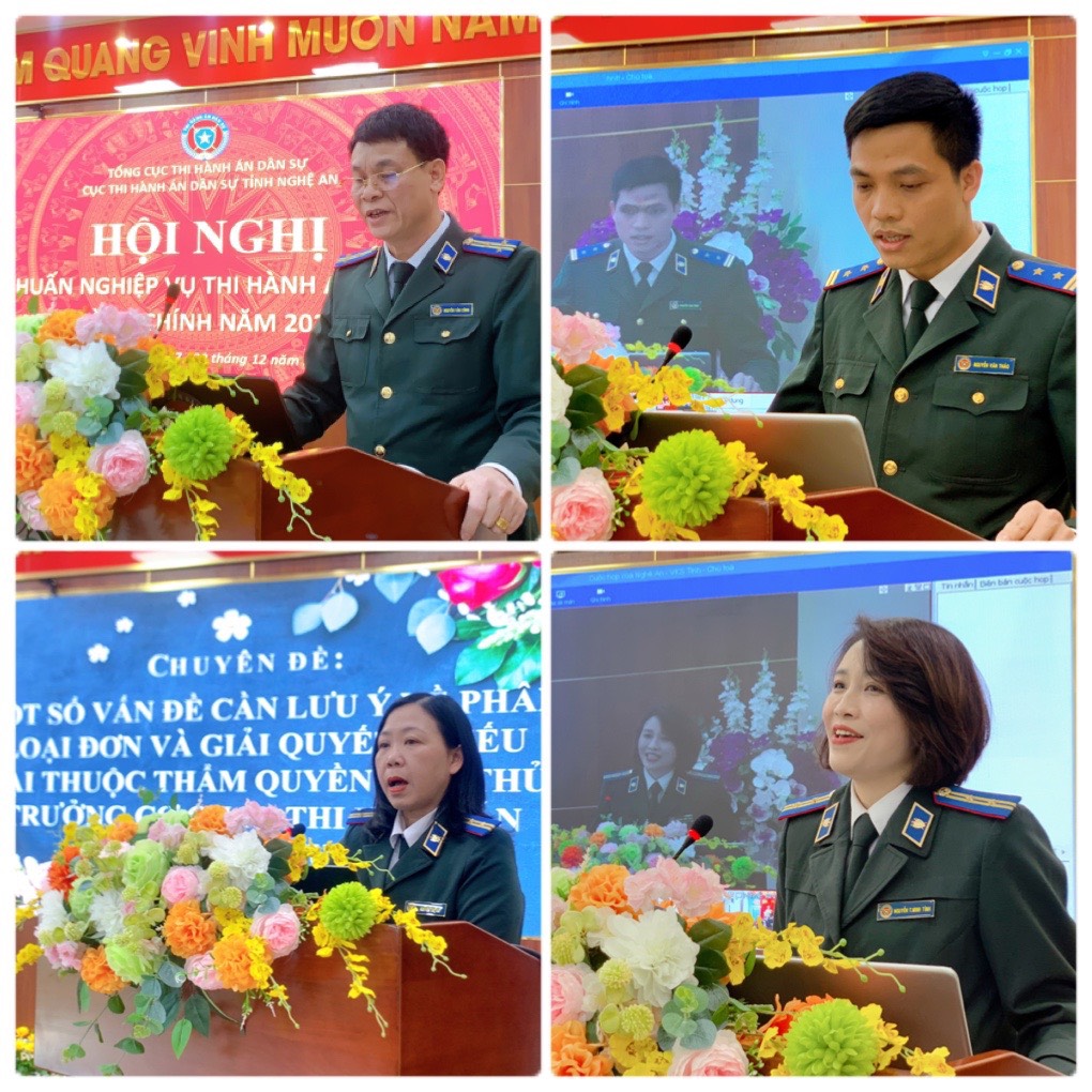 Thực hiện Kế hoạch số 1232/KH-BCĐTHADS ngày 28/8/2023 của Ban chỉ đạo Thi hành án dân sự tỉnh Nghệ An về tổ chức Hội nghị tập huấn nghiệp vụ chuyên sâu về công tác thi hành án dân sự và thi hành án hành chính năm 2023, sáng ngày 27/12/2023, Cục Thi hành án dân sự (THADS) tỉnh Nghệ An tổ chức khai mạc Hội nghị tập huấn công tác Thi hành án dân sự, hành chính năm 2023 bằng hình thức trực tuyến.Tham dự hội nghị tại điểm cầu cấp tỉnh có các đồng chí Lãnh đạo Cục, Lãnh đạo các phòng chuyên môn, Chấp hành viên, thẩm tra viên, Thư ký, Kế toán, Thủ kho; tại điểm cầu cấp huyện, thành phố, thị xã có sự tham gia của Lãnh đạo Chi cục, Chấp hành viên, Thẩm tra viên, Thư ký, Chuyên viên, Kế toán, Thủ kho của đơn vị.