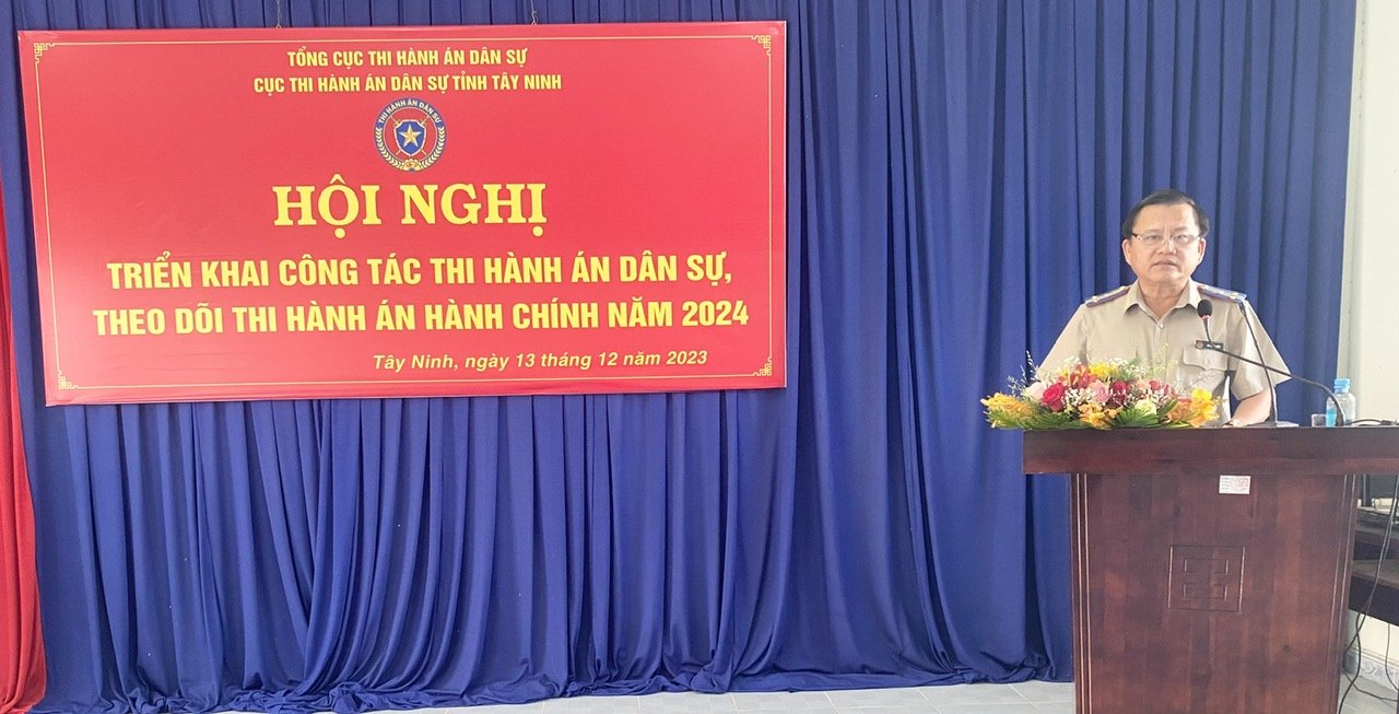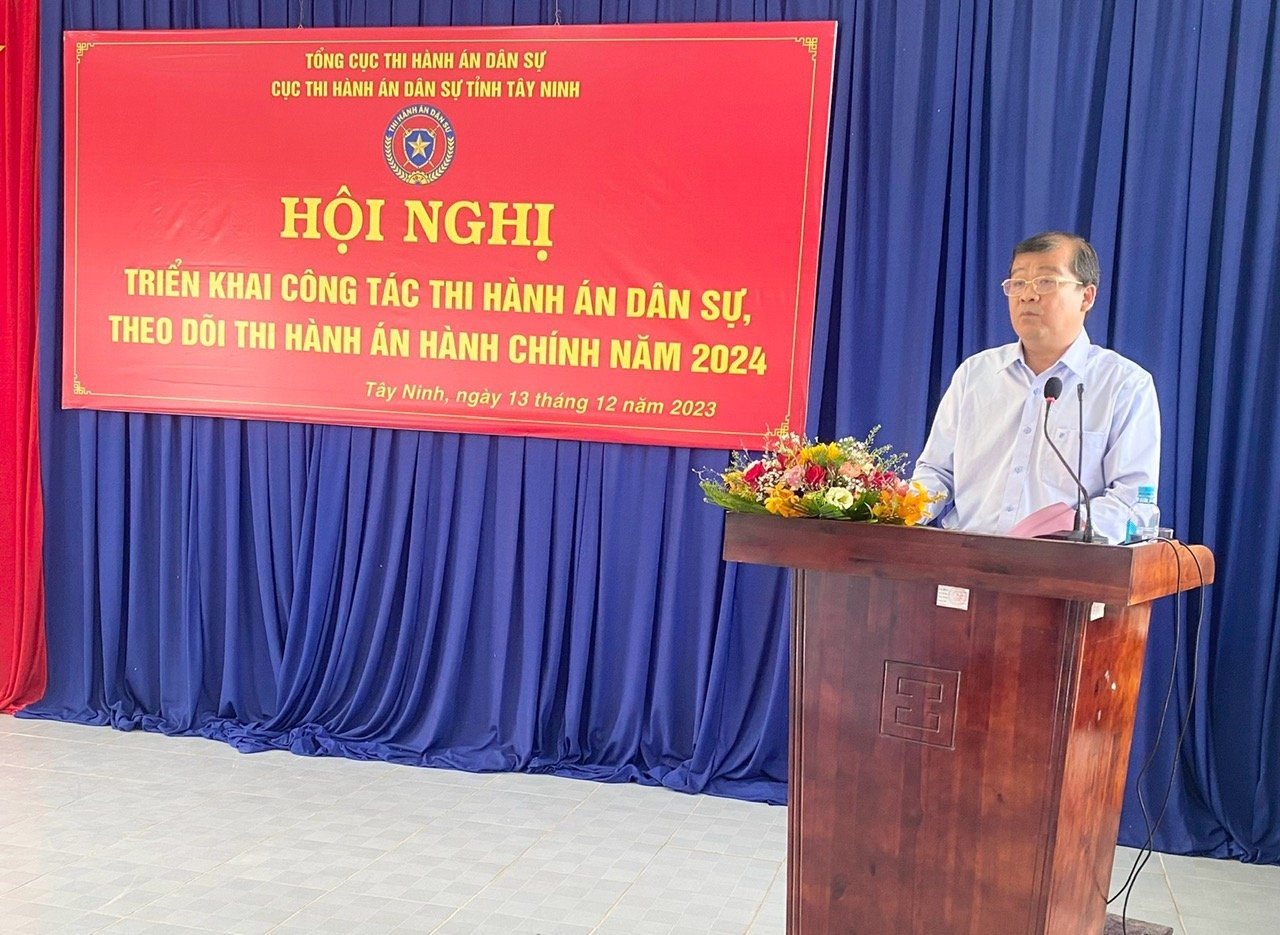 Thực hiện chỉ đạo của Tổng cục Thi hành án dân sự (THADS), được sự nhất trí của Ủy ban nhân dân tỉnh, chiều ngày 13/12/2023, Cục THADS tỉnh Tây Ninh tổ chức Hội nghị triển khai công tác thi hành án dân sự, theo dõi thi hành án hành chính năm 2024. Đến dự và chỉ đạo Hội nghị, có ông Võ Đức Trong - Ủy viên Ban thường vụ Tỉnh ủy, Phó Chủ tịch Thường trực Ủy ban nhân dân tỉnh, Trưởng Ban chỉ đạo THADS tỉnh; đại diện Lãnh đạo Ban Nội chính Tỉnh ủy, Ban Pháp chế HĐND tỉnh, Ngân hàng Nhà nước chi nhánh tỉnh Tây Ninh; thành viên Ban chỉ đạo THADS tỉnh, Trưởng Ban chỉ đạo THADS các huyện, thị xã, thành phố. Về phía Cục THADS, có ông Võ Xuân Biên - Cục trưởng Cục THADS, các Phó Cục trưởng Cục THADS, Lãnh đạo Chi cục THADS huyện, thị xã, thành phố, Lãnh đạo các phòng chuyên môn thuộc Cục, Chấp hành viên, Thẩm tra viên, Kế toán các cơ quan THADS trong tỉnh.