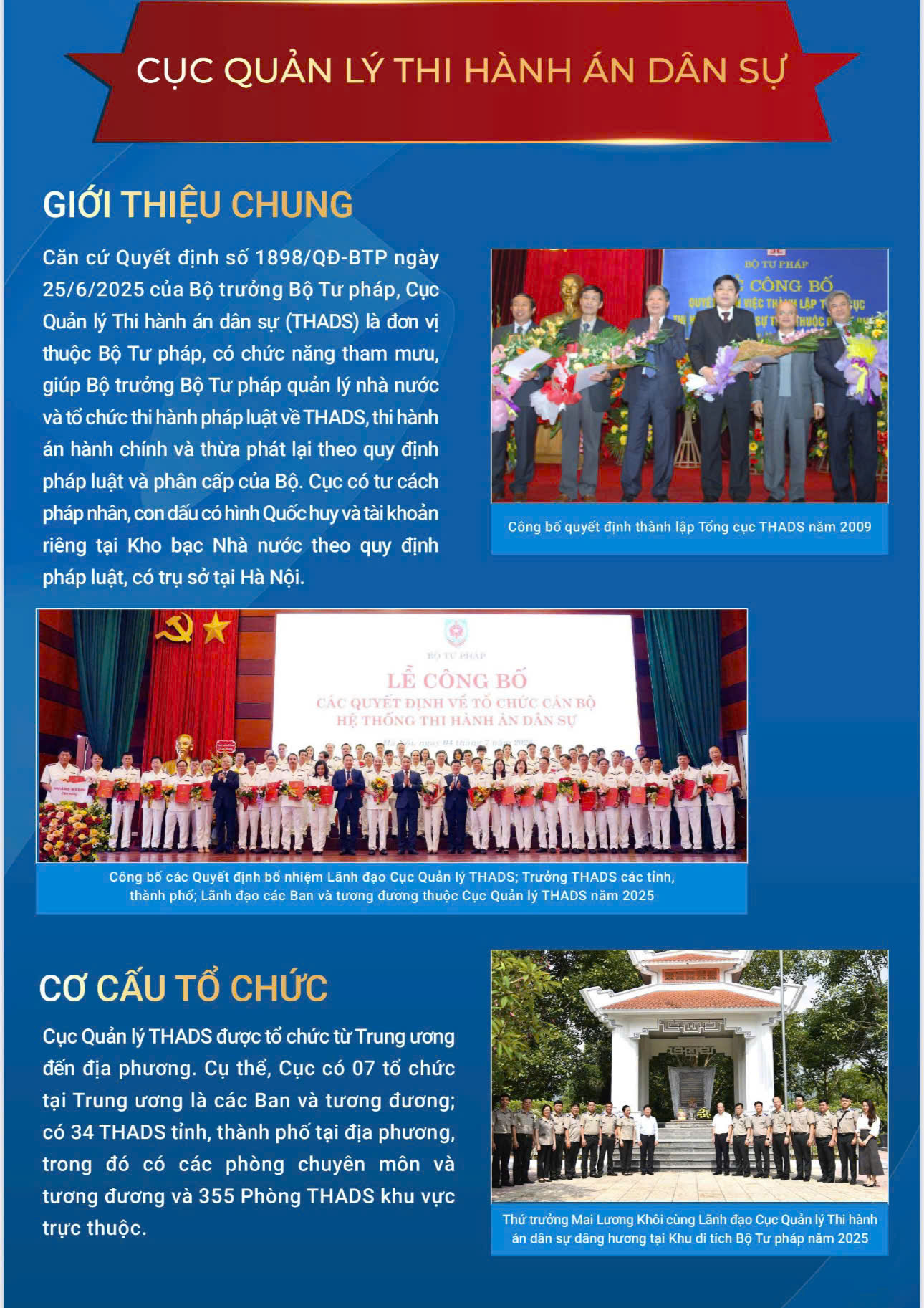Trong không gian khu trưng bày Lịch sử 80 năm, bên cạnh những dấu mốc lớn của ngành, gian trưng bày còn giới thiệu về cơ cấu tổ chức bộ máy của Bộ Tư pháp qua các thời kỳ và cơ cấu tổ chức hiện nay của Bộ theo Nghị định số 39/2025/NĐ-CP ngày 26/02/2025. Về Cục Quản lý Thi hành án dân sự, được giới thiệu là đơn vị thuộc Bộ Tư pháp, theo Quyết định số 1898/QĐ-BTP ngày 25/6/2025 của Bộ trưởng Bộ Tư pháp, là đơn vị có nhiệm vụ tham mưu, giúp Bộ trưởng quản lý nhà nước và tổ chức thi hành pháp luật về thi hành án dân sự, thi hành án hành chính và thừa phát lại. Cục được tổ chức từ Trung ương đến địa phương gồm 07 tổ chức là các Ban và tương đương ở Trung ương, 34 THADS tỉnh, thành phố tại địa phương trong đó có các phòng chuyên môn và tương đương và 355 Phòng THADS khu vực trực thuộc.