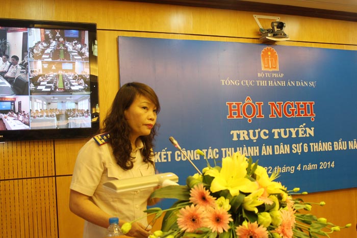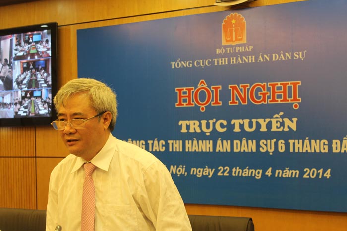 Sáng nay (22/4), tại trụ sở Bộ Tư pháp, Tổng cục Thi hành án dân sự đã tổ chức Hội nghị sơ kết công tác thi hành án dân sự 06 tháng đầu năm 2014 bằng hình thức giao ban trực tuyến tại 07 điểm cầu: Hà Nội, Yên Bái, Hà Tĩnh, Đà Nẵng, Đăk Lăk, thành phố Hồ Chí Minh và Cần Thơ. Tham dự Hội nghị có Thứ trưởng Bộ Tư pháp Đinh Trung Tụng, Lãnh đạo Ban Nội chính Trung ương, Ủy ban tư pháp của Quốc Hội, Văn phòng Ban Chỉ đạo Cải cách tư pháp Trung ương, Văn phòng chính phủ, Viện Kiểm sát nhân dân tối cao, Tòa án nhân dân tối cao, Cục Thi hành án Bộ Quốc phòng, các đơn vị thuộc bộ, các Cục Thi hành án dân sự và Lãnh đạo các đơn vị chuyên môn thuộc Tổng cục.