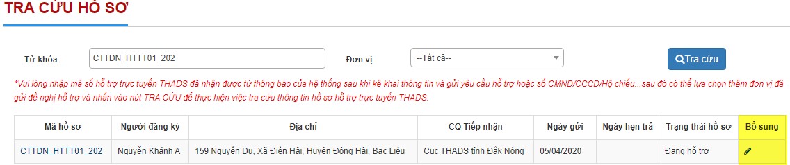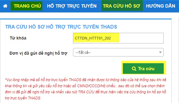 Ngay sau khi kê khai, gửi thành công yêu cầu hỗ trợ trực tuyến, quý khách có thể tra cứu thông tin trên phần mềm bằng cách vào TRANG CHỦ hoặc TRA CỨU HỒ SƠ và nhập vào mã số trực tuyến đã nhận được ở bước 2 hoặc số chứng minh nhân dân/số căn cước công dân… và bấm vào nút Tra cứu để thực hiện tra cứu thông tin hỗ trợ từ cơ quan THADS.