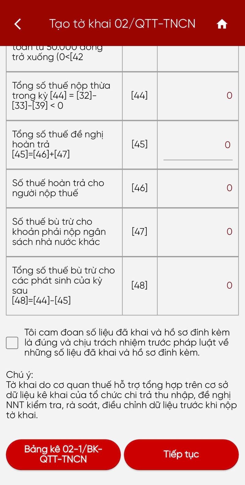 Bước 6: Nhấn Tiếp tục, hệ thống hiển thị màn kê khai các chỉ tiêu trên tờ khai từ [20] đến [48], cho phép sửa dữ liệu.