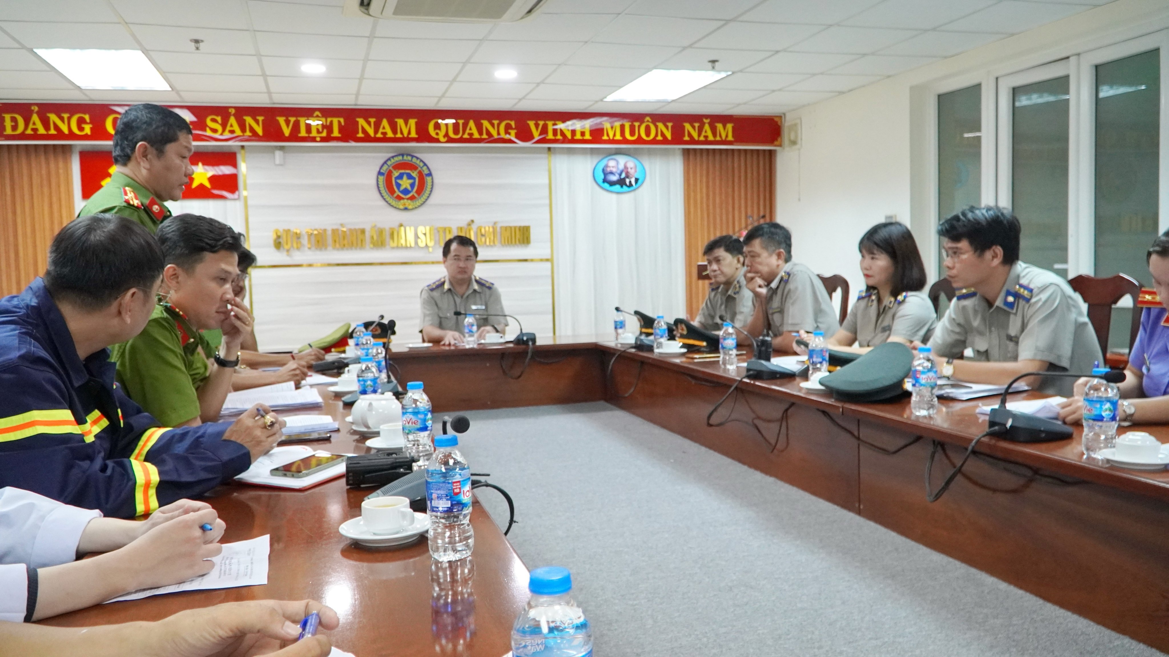 Trước khi tiến hành cưỡng chế, Hội đồng cưỡng chế đã tổ chức họp tại Cục THADS TP.HCM, nghe các đơn vị phối hợp thông tin lại tình hình an ninh trật tự tại khu vực tổ chức cưỡng chế, Hội đồng cưỡng chế cùng nhất trí các phương án, xử lý tình huống để tiến hành cưỡng chế đạt kết quả, sau đó di chuyển đến điểm tổ chức cưỡng chế.
