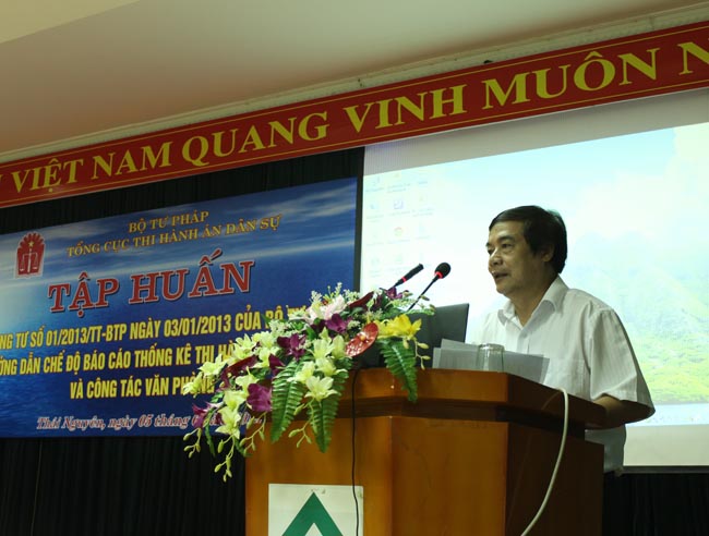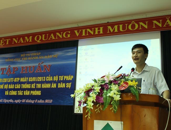 Thực hiện Quyết định số 1176/QĐ-BTP của Bộ trưởng Bộ Tư pháp về việc ban hành Kế hoạch tổ chức lớp tập huấn về thực hiện Thông tư số 01/2013/TT-BTP ngày 03/01/2013 của Bộ Tư pháp hướng dẫn Chế độ báo cáo thống kê thi hành án dân sự và một số nội dung về công tác văn phòng, sáng ngày 05/6/2013, tại thành phố Thái Nguyên, Tổng cục Thi hành án dân sự phối hợp với trường Trung cấp luật Thái Nguyên và Cục Thi hành án dân sự tỉnh Thái Nguyên đã khai mạc lớp tập huấn ở khu vực miền Bắc.