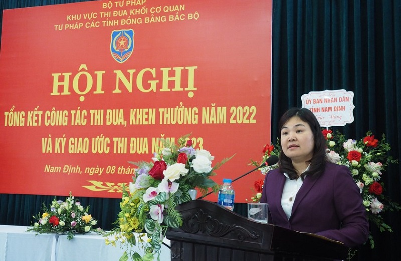 Phát biểu chào mừng Hội nghị, Phó Chủ tịch UBND tỉnh Nam Định Hà Lan Anh cảm ơn Bộ Tư pháp và các Bộ ngành Trung ương trong nhiều năm qua đã quan tâm lãnh đạo, chỉ đạo đối với việc triển khai thực hiện nhiệm vụ công tác Tư pháp của các tỉnh, thành phố trực thuộc Trung ương, trong đó có các tỉnh khu vực Đồng bằng Bắc Bộ và tỉnh Nam Định, tạo điều kiện giúp đỡ để các cơ quan tư pháp hoàn thành tốt nhiệm vụ được giao.