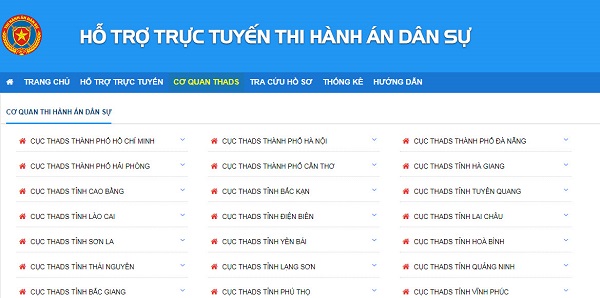 Mỗi Cục Thi hành án dân sự được tạo một trang riêng, bao gồm các mục tương ứng với mục Trang chủ: Nộp hồ sơ trực tuyến, Danh sách các Chi cục, Tra cứu, Thống kê dữ liệu của Cục,…