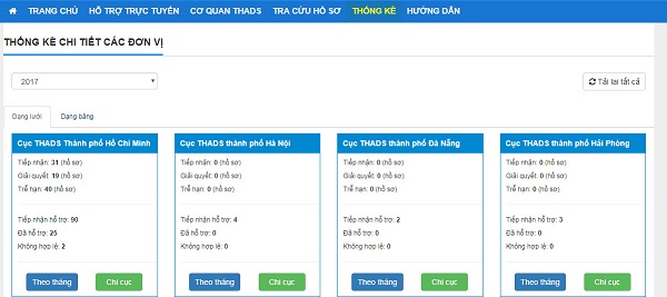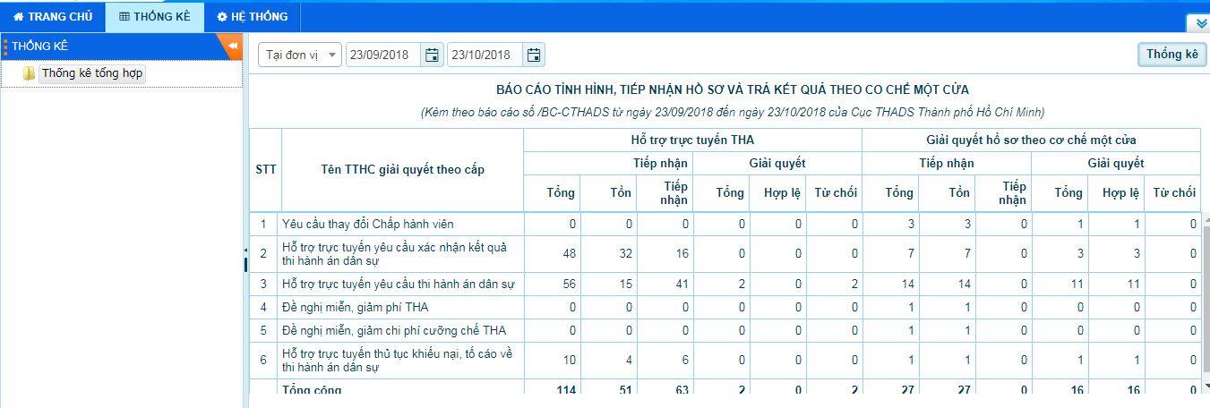 Thống kê tình hình hỗ trợ trực tuyến, tiếp nhận hồ sơ tại bộ phận một cửa của các cơ quan thi hành án dân sự có trong hệ thống