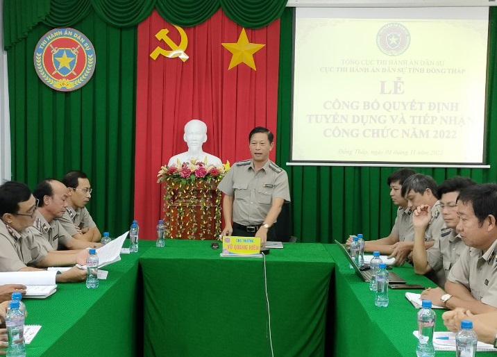 Chiều ngày 03/11/2022, tại trụ sở Cục Thi hành án dân sự tỉnh Đồng Tháp, Cục Thi hành án dân sự tỉnh Đồng Tháp tổ chức Lễ công bố quyết định tuyển dụng và tiếp nhận công chức năm 2022. Cục trưởng Vũ Quang Hiện chủ trì buổi Lễ.