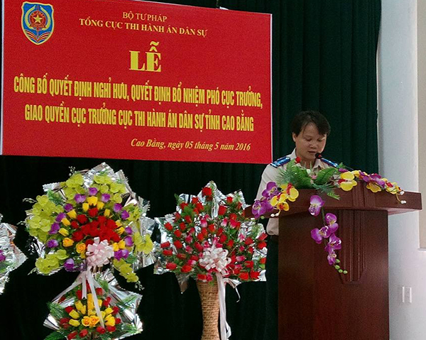 Phát biểu tại Buổi lễ, đồng chí Phó Tổng cục trưởng Nguyễn Thanh Thủy cảm ơn sự quan tâm của Tỉnh ủy, UBND tỉnh Cao Bằng đối với công tác THADS và đánh giá cao kết quả công tác mà Cục thi hành án dân sự tỉnh Cao Bằng đạt được trong thời gian qua đã góp phần tích cực vào sự chuyển biến chung của hệ thống thi hành án dân sự toàn quốc, trong đó có sự đóng góp rất lớn của đồng chí Nông Văn Huyền – nguyên Cục trưởng Cục THADS tỉnh Cao Bằng và các đồng chí lãnh đạo, công chức, người lao động của ngành thi hành án dân sự tỉnh Cao Bằng.