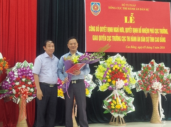 Phát biểu chúc mừng và giao nhiệm vụ Quyền cục trưởng Cục Thi hành án dân sự tỉnh Cao Bằng đối với đồng chí Đặng Văn Huy, đồng chí Phó Tổng cục trưởng yêu cầu đồng chí Đặng Văn Huy tiếp tục phát huy kết quả mà Cục Thi hành án dân sự tỉnh Cao Bằng đã đạt được trong thời gian qua, khắc phục các tồn tại, hạn chế, đoàn kết cùng tập thể lãnh đạo Cục thi hành án dân sự tỉnh Cao Bằng hoàn thành tốt các nhiệm vụ được giao. Phát biểu nhận nhiệm vụ, đồng chí Đặng Văn Huy bày tỏ cảm ơn sự quan tâm của Lãnh đạo Bộ, Tổng cục, Lãnh đạo Tỉnh ủy tỉnh Cao Bằng, Lãnh đạo Cục Thi hành án dân sự tỉnh Cao Bằng và nhất là sự ủng hộ, những đóng góp của đồng chí Nông Văn Huyền đối với công tác thi hành án dân sự của tỉnh Cao Bằng trong những năm qua. Đồng chí Đặng Văn Huy xin hứa tiếp thu nghiêm túc, đầy đủ ý kiến chỉ đạo giao nhiệm vụ và những căn dặn của đồng chí Phó Tổng cục trưởng và xin hứa phấn đấu, nỗ lực, cố gắng phát huy năng lực và kinh nghiệm của bản thân để hoàn thành tốt nhiệm vụ, khắc phục tối đa các tồn tại, hạn chế, cùng tập thể lãnh đạo Cục đoàn kết thống nhất xây dựng các cơ quan thi hành án dân sự tỉnh Cao Bằng ngày một vững mạnh, hoàn thành xuất sắc các nhiệm vụ được giao, xứng đáng với với sự tin tưởng, tín nhiệm của Lãnh đạo Bộ Tư pháp, Lãnh đạo Tổng cục, Lãnh đạo Tỉnh ủy, Ủy ban nhân dân tỉnh Cao Bằng và tập thể cán bô, công chức, người lao động của các cơ quan thi hành án dân sự tỉnh Cao Bằng.