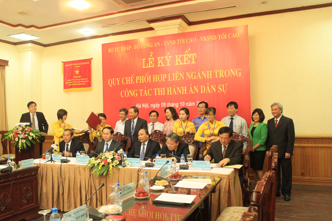 Ngày 09/10/2013, tại trụ sở Bộ Tư pháp, đã diễn ra Lễ ký kết Quy chế phối hợp liên ngành giữa Bộ Tư pháp – Bộ Công an – Tòa án nhân dân tối cao – Viện Kiểm sát nhân dân tối cao trong công tác thi hành án dân sự. Tới dự Lễ ký có đồng chí Nguyễn Xuân Phúc, Ủy viên Bộ Chính trị, Phó Thủ tướng Chính phủ; các đồng chí Bộ trưởng Bộ Công an, Chánh án Tòa án nhân dân tối cao, Viện trưởng Viện Kiểm sát nhân dân tối cao, Bộ trưởng Bộ Tư pháp; Lãnh đạo Ban chỉ đạo cải cách tư pháp Trung ương, Ban Nội chính Trung ương, Văn phòng Quốc hội, Văn phòng Chính phủ; các đồng chí Thứ trưởng Bộ Tư pháp, Bộ Công an, Tòa án nhân dân tối cao, Viện Kiểm sát nhân dân tối cao và Thủ trưởng các đơn vị có liên quan.