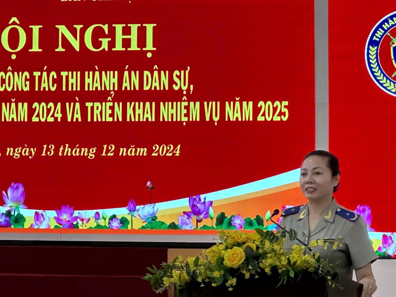 Phát biểu tại hội nghị, Phó Tổng cục trưởng Tổng cục THADS – đ/c Trần Thị Phương Hoa chúc mừng kết quả đạt được của BCĐ THADS tỉnh năm 2024, công tác THADS trên địa bàn tỉnh Long An là địa bàn lớn, về việc đứng thứ 4, về tiền đứng thứ 5 cả nước, có nhiều vụ án phức tạp, kéo dài, có nhiều khó khăn, kết quả năm 2024, đạt và vượt chỉ tiêu Tổng cục giao về việc và tiền, đó là sự nỗ lực rất lớn của cán bộ công chức các cơ quan THADS tỉnh, trong đó có vai trò của BCĐ THADS 2 cấp lãnh, chỉ đạo trong công tác phối hợp THADS. Thay mặt lãnh đạo Tổng cục, đ/c Trần Thị Phương Hoa trân trọng cảm ơn sự quan tâm lãnh đạo, chỉ đạo sát sao của Tỉnh ủy, Hội đồng nhân dân, Ủy ban nhân dân, BCĐTHADS tỉnh, cấp huyện đã phối hợp chặt chẽ trong công tác THADS, đặc biệt là đồng chí Trưởng ban chỉ đạo THADS tỉnh đã quan tâm, chỉ đạo công tác THADS tỉnh trong thời gian vừa qua.