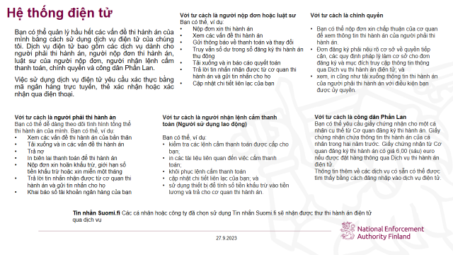Dịch vụ thi hành điện tử cũng có sẵn bằng tiếng Anh tại địa chỉ: asiointi2.oikeus.fi/ulosotto. Dịch vụ điện tử bao gồm các dịch vụ dành cho người phải thi hành án, người nộp đơn thi hành án, luật sư của người nộp đơn, người nhận lệnh cấm thanh toán, chính quyền và công dân Phần Lan