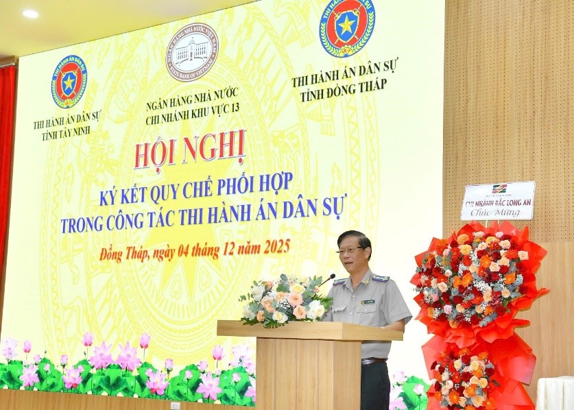 Trưởng THADS tỉnh Đồng Tháp Vũ Quang Hiện phát biểu đây là sự kiện có ý nghĩa quan trọng, góp phần tăng cường hiệu lực quản lý nhà nước, nâng cao hiệu quả xử lý tài sản, thu hồi nợ, bảo đảm quyền và lợi ích hợp pháp của Nhà nước, tổ chức tín dụng và người dân. Trong thời gian qua, số lượng vụ việc thi hành án liên quan đến tín dụng, ngân hàng chiếm tỷ lệ lớn về giá trị, tính chất phức tạp, giá trị thi hành cao. Để thực hiện hiệu quả, rất cần cơ chế phối hợp kịp thời, thống nhất, đặc biệt là việc cung cấp thông tin tài khoản, trạng thái tài sản bảo đảm, xử lý tài sản, xác minh điều kiện thi hành án. Quy chế phối hợp được ký kết hôm nay sẽ tạo hành lang pháp lý đồng bộ, rõ ràng, giúp hai ngành thực hiện nhiệm vụ nhanh hơn, chính xác hơn và minh bạch hơn.