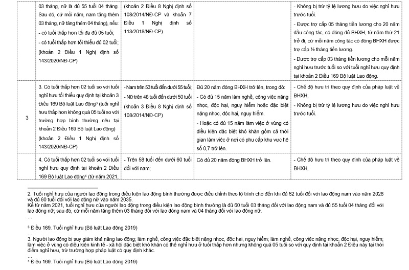 - Những người có tuổi thấp hơn đủ 03 tuổi so với tuổi nghỉ hưu quy định tại khoản 2 Điều 169 Bộ luật Lao động, có đủ 20 năm đóng BHXH trở lên (trước đây quy định tại khoản 2 Điều 9 Nghị định số 108/2014/NĐ-CP là có đủ 52 tuổi trở lên đối với nam, đủ 47 tuổi trở lên đối với nữ).