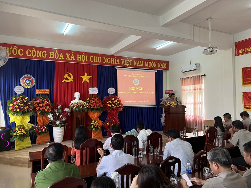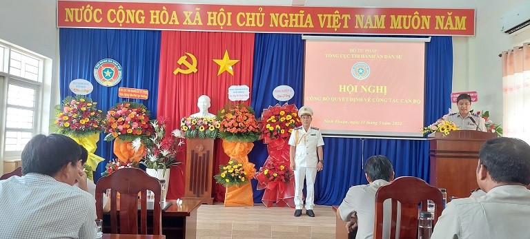 Chiều 31/5/2024, Cục Thi hành án dân sự tỉnh Ninh Thuận tổ chức Hội nghị công bố quyết định của Tổng cục trưởng Tổng cục Thi hành án dân sự về việc bổ nhiệm công chức giữ chức vụ lãnh đạo, quản lý. Dự hội nghị có đồng chí Lê Hữu Hồng, bí thư chi bộ, Cục trưởng Cục Thi hành án dân sự tỉnh; đại diện lãnh đạo Ban Tổ chức, Ban Nội chính Tỉnh ủy; lãnh đạo các cơ quan Sở Tư pháp, Công an tỉnh, Toà án nhân dân tỉnh và toàn thể lãnh đạo chủ chốt, công chức thuộc cơ quan Thi hành án dân sự tỉnh.