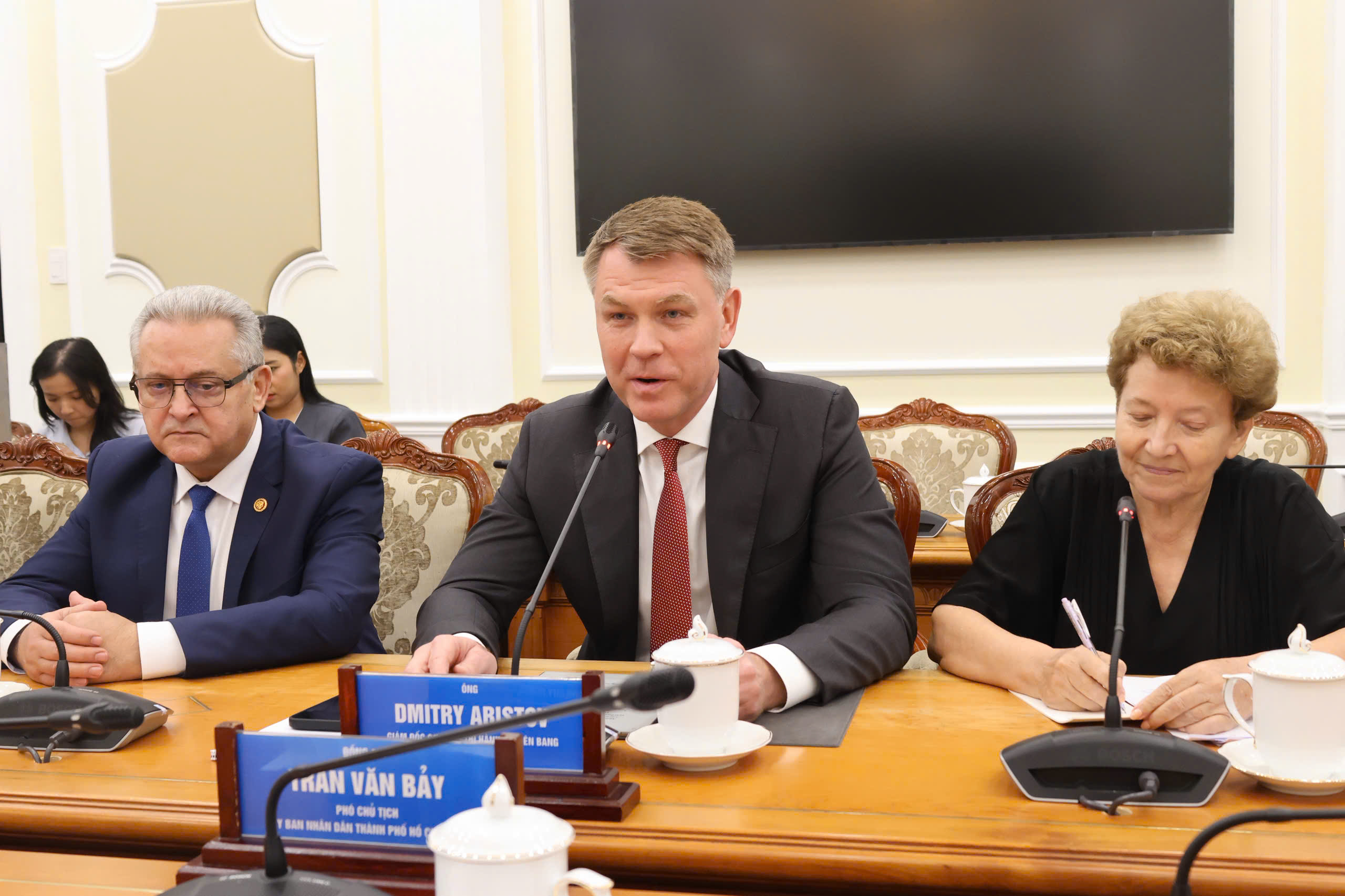 Chiều 4/12, Phó Chủ tịch UBND TP.HCM Trần Văn Bảy đã tiếp ông Dmitry Aristov và đoàn công tác. Tại buổi tiếp, Phó Chủ tịch UBND TP.Hồ Chí Minh Trần Văn Bảy nhấn mạnh, thời gian qua, quan hệ Đối tác chiến lược toàn diện Việt Nam - Liên bang Nga tiếp tục được tăng cường và phát triển, trao đổi đoàn và tiếp xúc các cấp được duy trì thường xuyên, tiêu biểu nhất là chuyến thăm Liên bang Nga của Tổng Bí thư Tô Lâm vào tháng 5/2025. Chuyến thăm đã diễn ra vào thời điểm hai nước vừa kỷ niệm 75 năm Ngày thiết lập quan hệ ngoại giao, cũng như đúng vào dịp kỷ niệm 70 năm Chủ tịch Hồ Chí Minh lần đầu tiên thăm chính thức Liên Xô trước đây và Liên bang Nga ngày nay. Trong khuôn khổ chuyến thăm, hai bên đã thông qua Tuyên bố chung về các định hướng chính trong quan hệ Đối tác chiến lược toàn diện Việt Nam - Nga trong giai đoạn mới. Những thành tựu của 75 năm hợp tác Việt Nam - Nga là nền tảng vững chắc và là động lực để hai bên củng cố, mở rộng và đưa quan hệ Đối tác chiến lược toàn diện đi vào chiều sâu, thực chất và hiệu quả, là hình mẫu hợp tác trong giai đoạn mới.