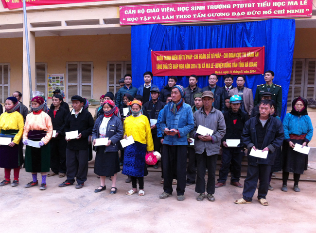 Phát biểu tại buổi tặng quà Trường tiểu học xã Ma Lé, thay mặt Đoàn công tác đồng chí Hồ Quang Huy, Phó Bí thư thường trực Đoàn Bộ Tư pháp cho biết: Trong những năm qua, với truyền thống lá lành đùm lá rách, Đoàn Thanh niên của Bộ Tư pháp nói riêng và Bộ Tư pháp nói chung thường xuyên tổ chức các hoạt động vì cộng đồng, hướng đến vùng đồng bào dân tộc thiểu số. Nhân dịp Xuân Giáp Ngọ năm 2014 sắp đến, cán bộ, công chức trẻ ngành Tư pháp mong muốn mang một chút hơi ấm, chia sẻ khó khăn với các em học sinh và bà con vùng cao. Hi vọng những phần quà nhỏ bé của Đoàn sẽ góp phần khích lệ, động viên các em học sinh tiếp tục cố gắng vươn lên trong học tập và giúp bà con có một cái Tết ấm áp, thắm đượm nghĩa tình.