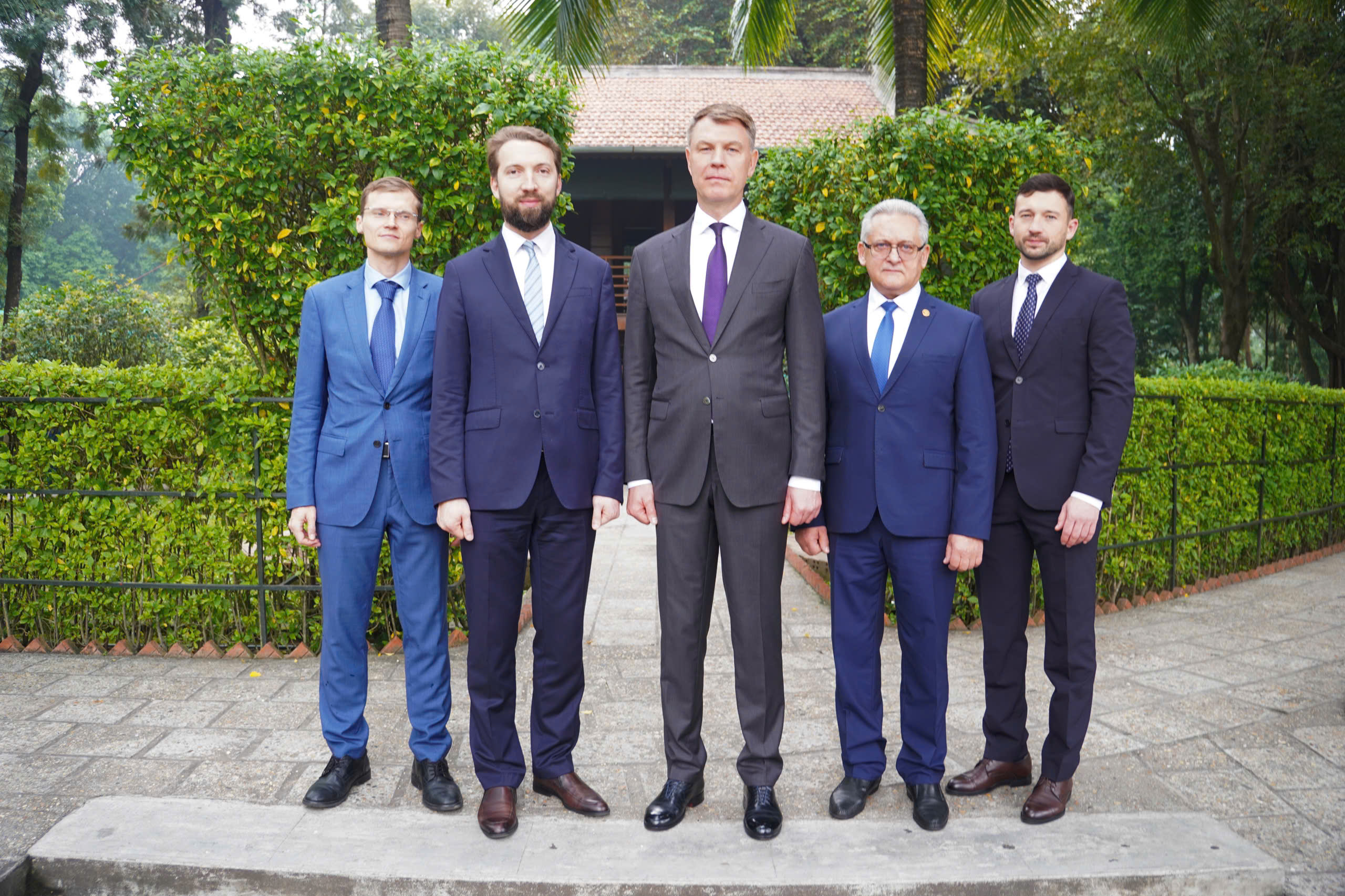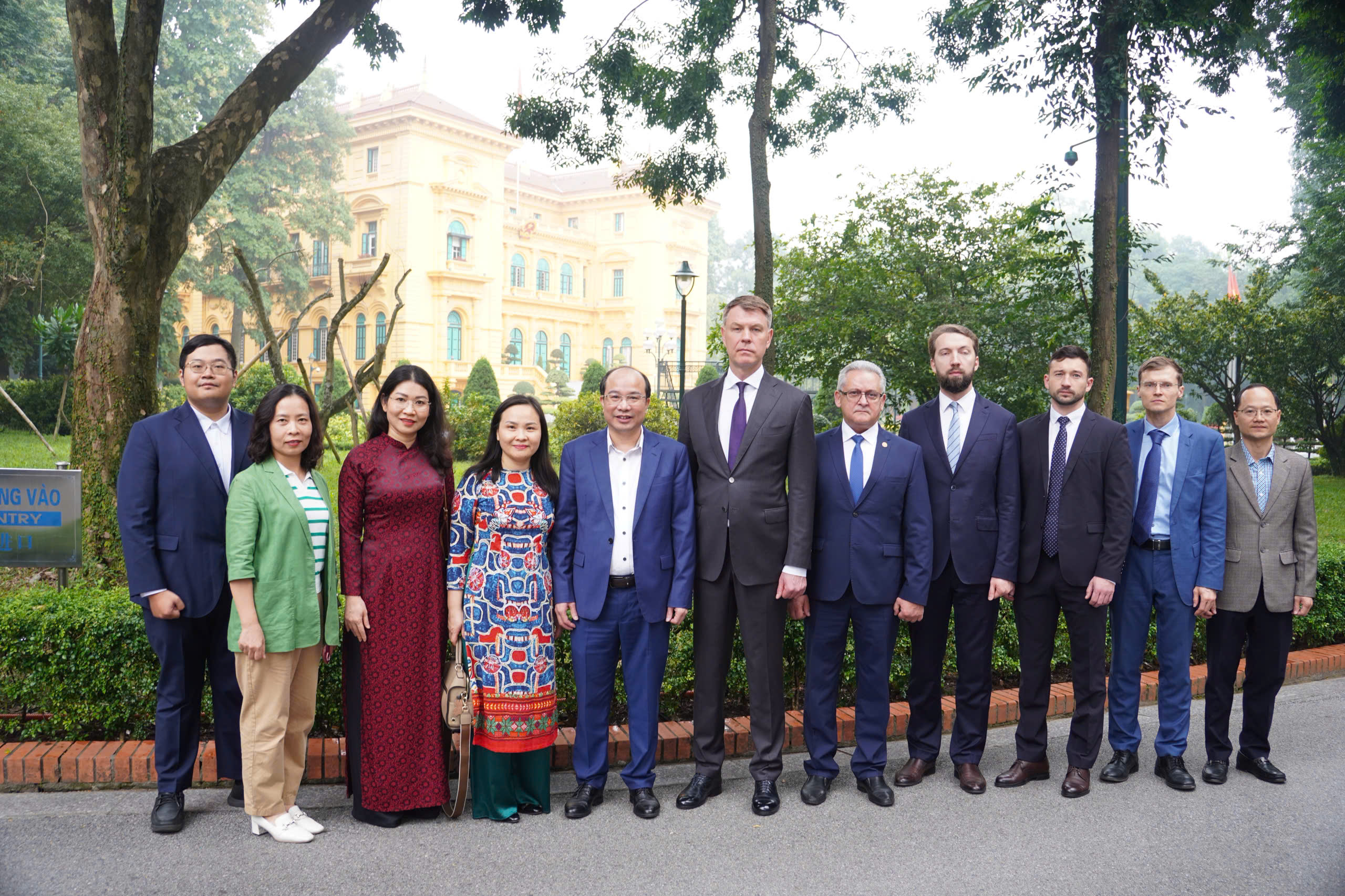 Đoàn công tác chụp ảnh kỷ niệm tại Phủ Chủ tịch, ao cá Bác Hồ và Nhà sàn trong Khu di tích Phủ Chủ tịch