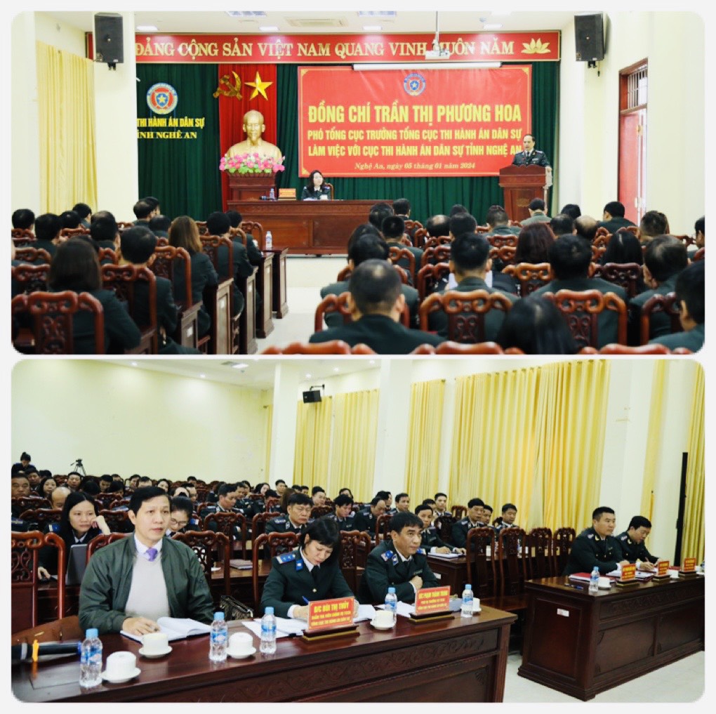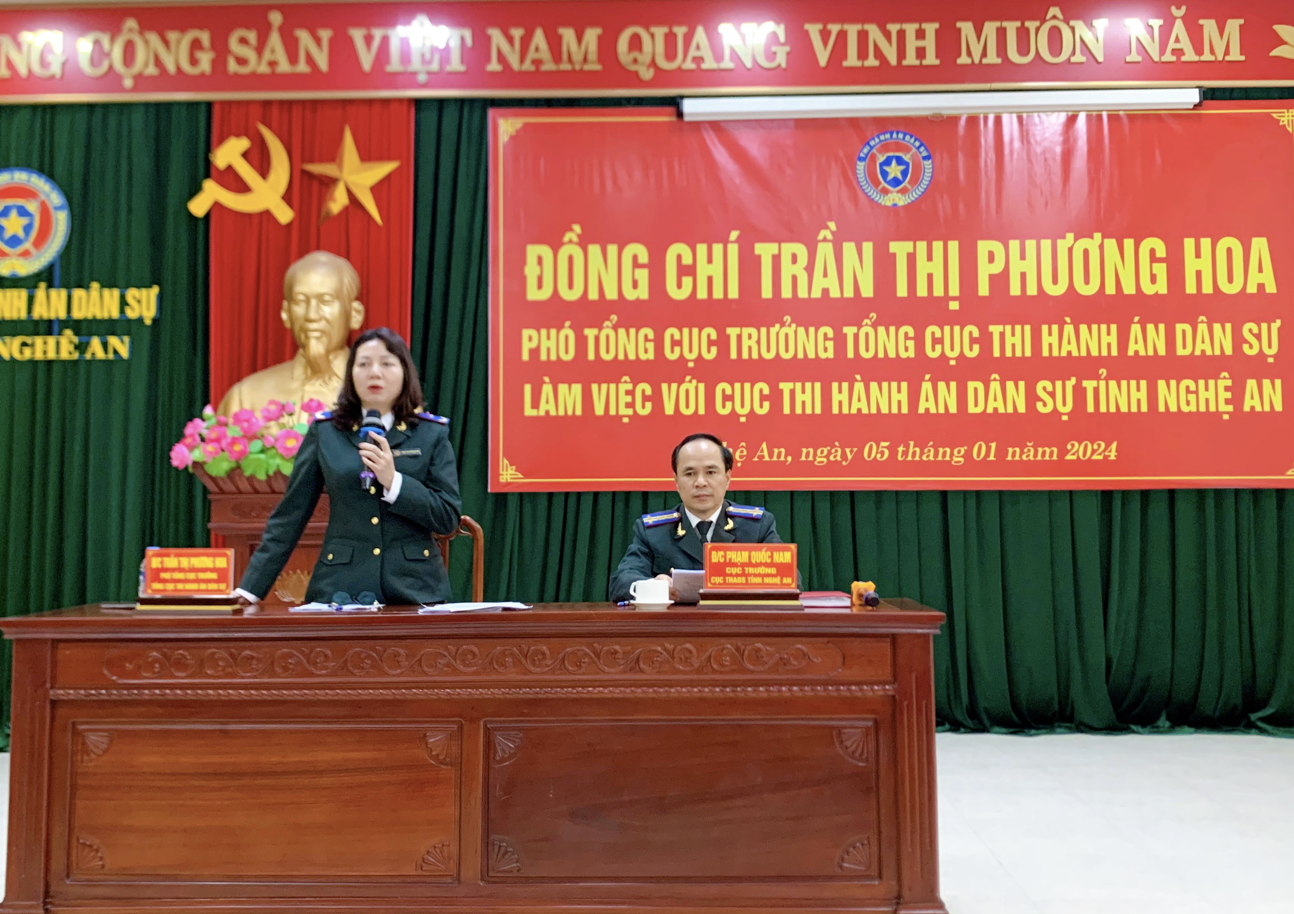 Phát biểu kết luận đồng chí Trần Thị Phương Hoa - Phó Tổng cục trưởng Tổng cục Thi hành án dân sự ghi nhận và đánh giá cao sự lãnh đạo, chỉ đạo của tập thể Lãnh đạo Cục, Chi cục THADS và toàn thể công chức, người lao động các cơ quan THADS tỉnh Nghệ An đối với công tác THADS, THAHC trong những năm vừa qua (từ 2019 -2023 đều được đánh giá xếp loại hoàn thành xuất sắc nhiệm vụ trong đó 03 năm được tặng Cờ Thi đua Ngành Tư pháp, 02 năm được tặng Cờ thi đua Chính phủ). Đồng thời ghi nhận những đề xuất, kiến nghị của địa phương. Để tiếp tục lãnh đạo, chỉ đạo đạt hoàn thành tốt các nhiệm vụ trong năm 2024, đồng chí Phó Tổng cục Tổng cục THADS trưởng yêu cầu các cơ quan THADS tỉnh Nghệ An tiếp tục thực hiện một số nhiệm vụ cụ thể như: Nhận diện, dự báo tình hình nhiệm vụ năm 2024 trên cơ sở đó bám sát chỉ tiêu nhiệm vụ được Tổng cục THADS giao để tổ chức thực hiện có hiệu quả; Làm tốt công tác tự kiểm tra, kiểm tra, công tác tiếp công dân, giải quyết đơn khiếu nại, tố cáo; tăng cường công tác tham mưu cho cấp ủy, chính quyền địa phương và công tác phối hợp trong THADS; rà soát kiện toàn tổ chức bộ máy kịp thời, đầy đủ; tiếp tục thực hiện các dự án đầu tư công giai đoạn 2021-2025 đúng tiến độ, chủ động đề xuất các dự án đưa vào đầu tư công giai đoạn 2026-2030…Quán triệt đầy đủ và triển khai thực hiện nghiêm túc Quy định 132 – QĐ/TW này 27/10/2023 của Ban Chấp hành Trung ương về kiểm soát quyền lực, phòng, chống tham nhũng, tiêu cực trong hoạt động điều tra, truy tố, xét xử, thi hành án và các chỉ đạo của Ngành, địa phương liên quan đến công tác phòng chống tiêu cực, tham nhũng trong hoạt động THADS.