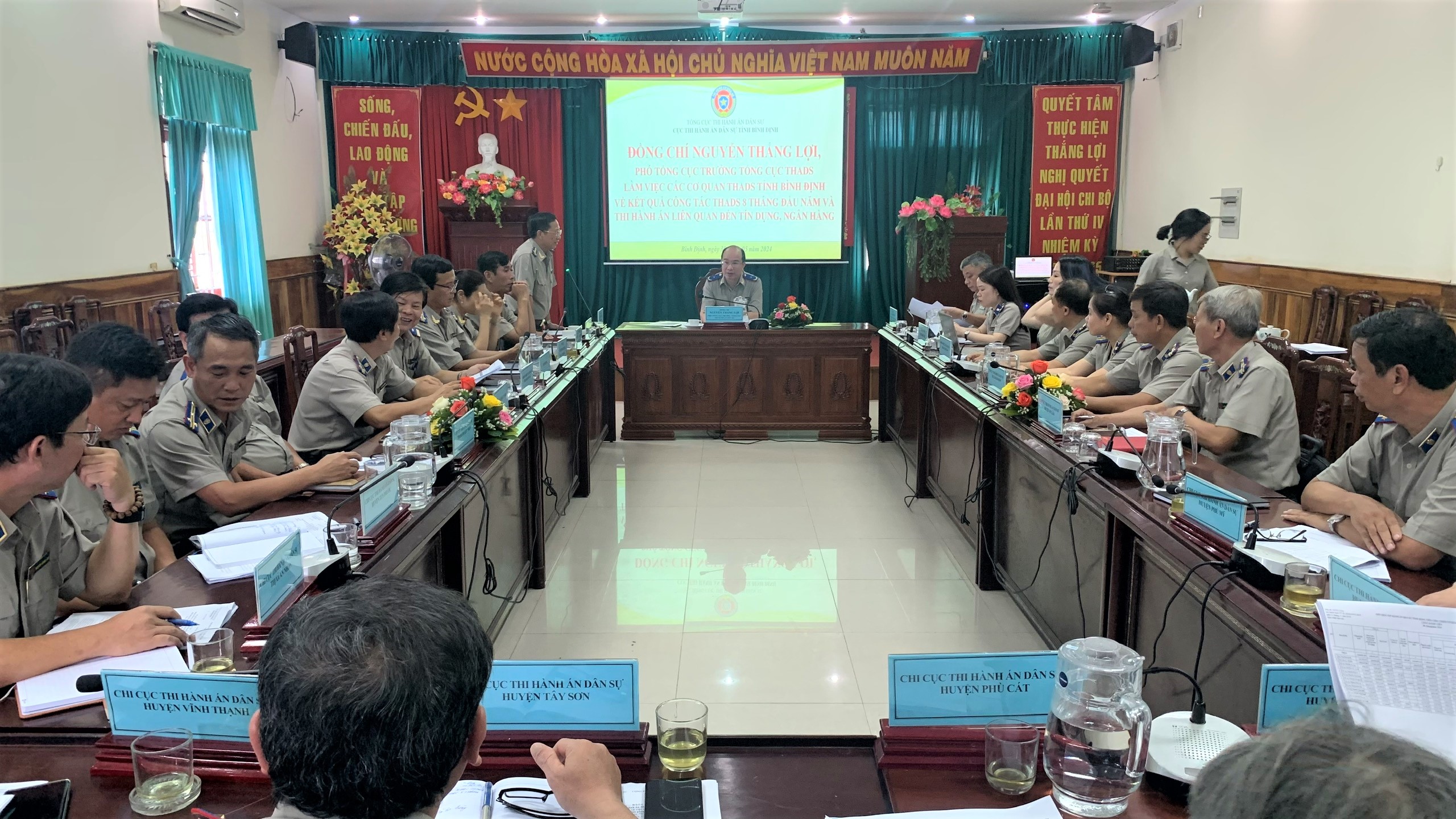Ngày 30 tháng 5 năm 2024, Phó Tổng cục trưởng Tổng cục Thi hành án dân sự Nguyễn Thắng Lợi và Đoàn công tác của Tổng cục Thi hành án dân sự (THADS) đã làm việc tại Cục THADS tỉnh Bình Định về kết quả công tác thi hành án dân sự 8 tháng đầu năm 2024; công tác kiểm tra, tự kiểm tra và việc thi hành án liên quan đến tín dụng, ngân hàng; đôn đốc thực hiện các chỉ tiêu, nhiệm vụ thi hành án dân sự trong 4 tháng cuối năm 2024. Tham dự buổi làm việc, có đồng chí Lê Anh Tuấn, Vụ trưởng Vụ Giải quyết khiếu nại, tố cáo -Tổng cục Thi hành án dân sự; Lãnh đạo Cục THADS, Lãnh đạo các đơn vị và Chấp hành viên thuộc Cục; Chi cục trưởng Chi cục THADS các huyện, thị xã, thành phố trong tỉnh.