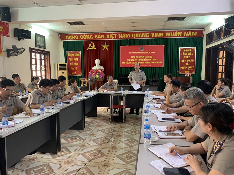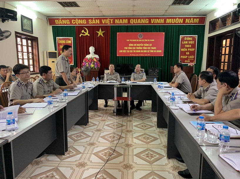 Ngày 16/7/2024, Đoàn công tác của Tổng cục Thi hành án dân sự (THADS) do Phó Tổng cục trưởng Nguyễn Thắng Lợi làm trưởng đoàn đã có buổi làm việc, nắm bắt tình hình kết quả thực hiện chỉ tiêu, nhiệm vụ về THADS, thi hành án hành chính 09 tháng năm 2024; Kết quả công tác thi hành án tín dụng ngân hàng và việc triển khai thực hiện Công văn số 693-CV/BCSĐ ngày 11/01/2024 của Ban cán sự đảng Bộ Tư pháp về việc lãnh đạo, chỉ đạo nâng cao hiệu quả công tác Thi hành án dân sự tại tỉnh Hà Giang. Cùng tham gia Đoàn công tác có đồng chí Nguyễn Ngọc Vũ - Vụ trưởng vụ tổ chức cán bộ Tổng cục THADS. Về phía cơ quan THADS tỉnh Hà Giang có đồng chí Lâm Anh Tuấn - Cục trưởng, các đồng chí Phó Cục trưởng; các đồng chí Trưởng phòng chuyên môn và tương đương; Chi cục trưởng các Chi cục THADS thành phố, huyện trực thuộc.