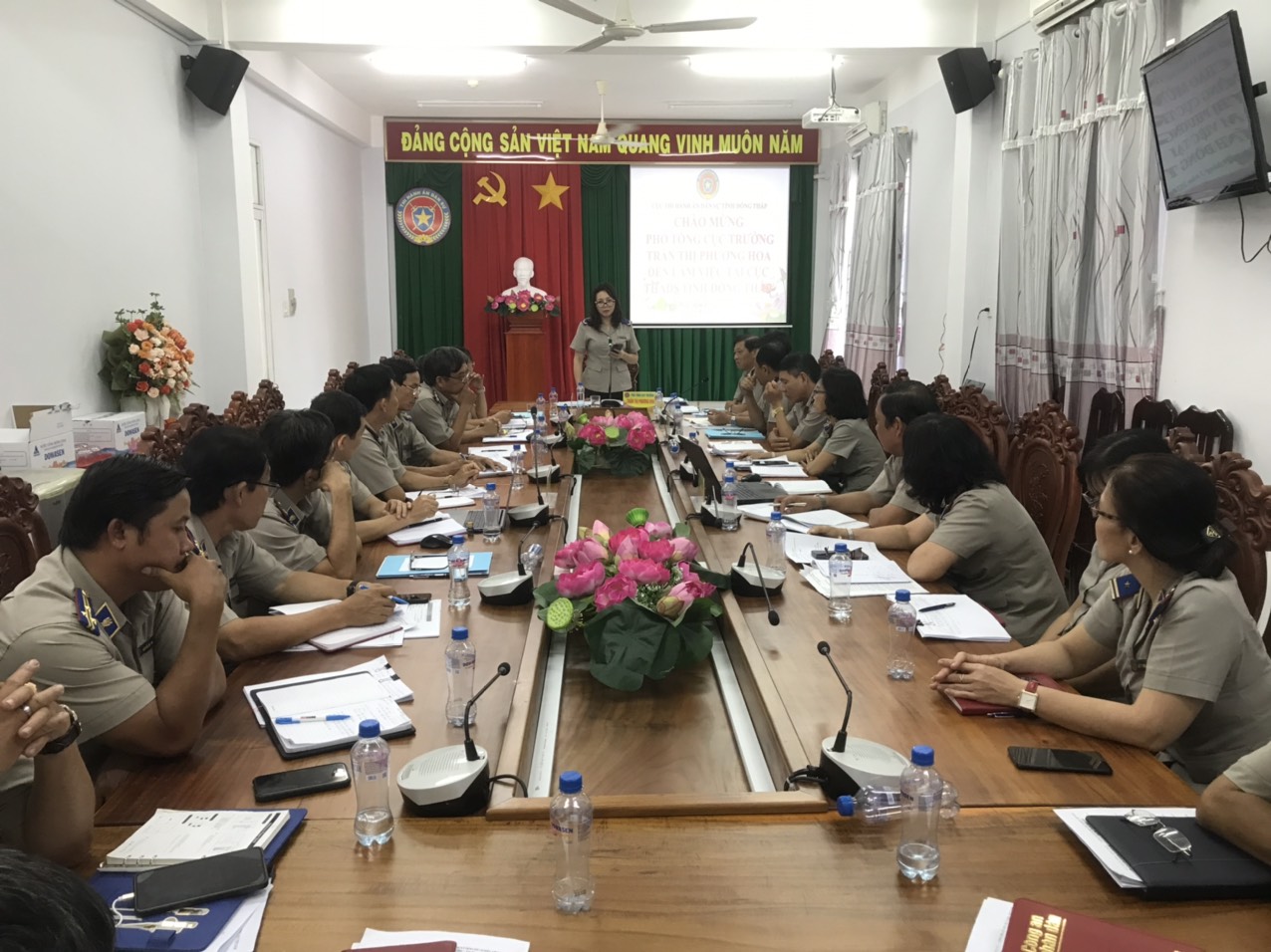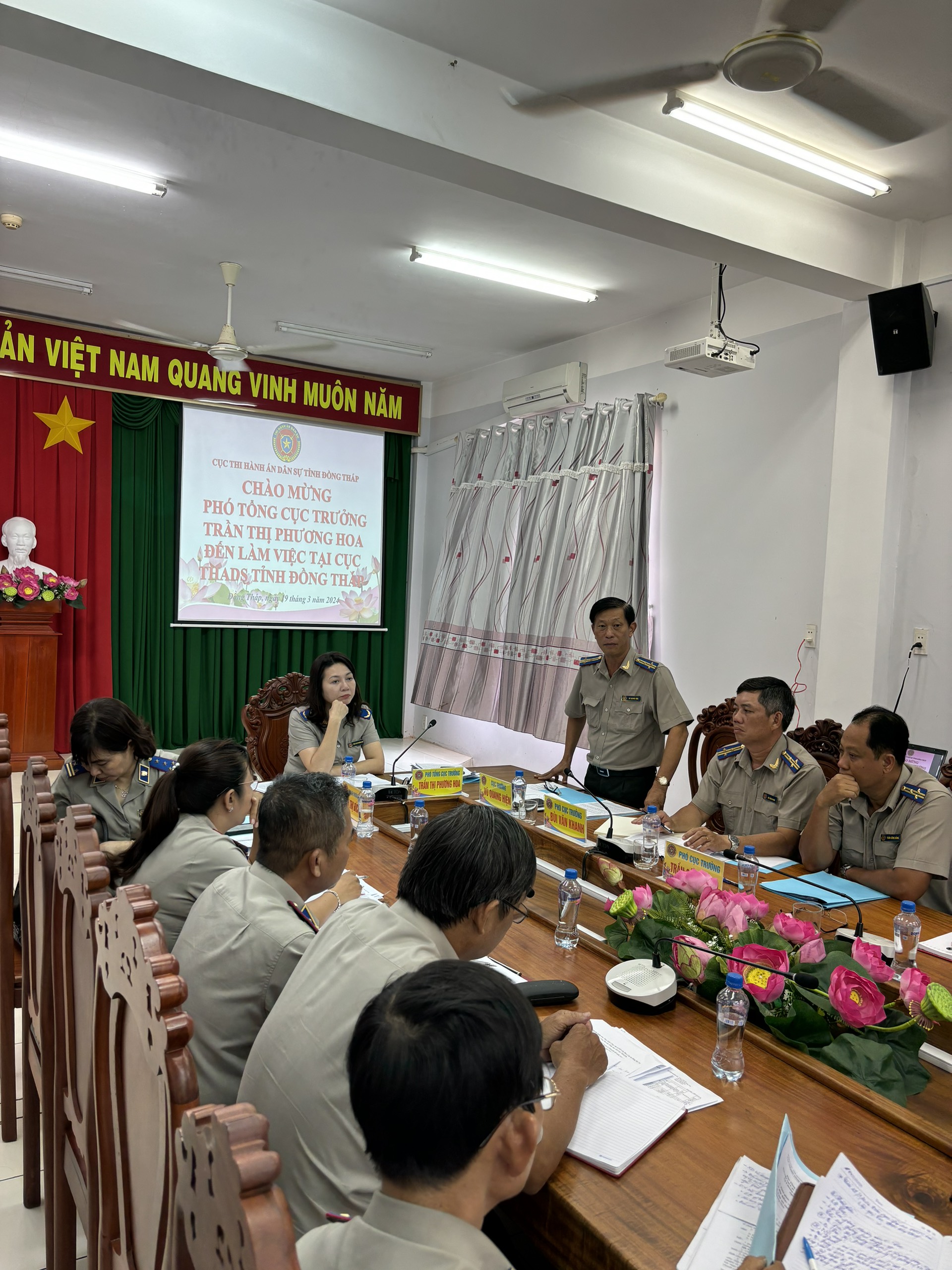 Phó Tổng cục trưởng ghi nhận những đề xuất kiến nghị của cơ quan THADS tỉnh Đồng Tháp về các hạng mục còn lại về xây dựng cơ bản của trụ sở làm việc Chi cục THADS huyện Hồng Ngự, hồ sơ phê duyệt dự án công trình hoàn thành trụ sở làm việc, kho vật chứng Chi cục THADS huyện Châu Thành, về kinh phí bảo trì trụ sở làm việc Cục THADS; về thực hiện các phần mềm hết sức khó khăn trong việc truy cập; về thực hiện chế độ báo cáo yêu cầu thời gian ngắn; việc hoàn thiện thể chế về công tác tổ chức cán bộ một quy trình quá nhiều văn bản áp dụng và một số vụ việc đã có văn bản xin hướng dẫn nghiệp vụ và chỉ đạo.