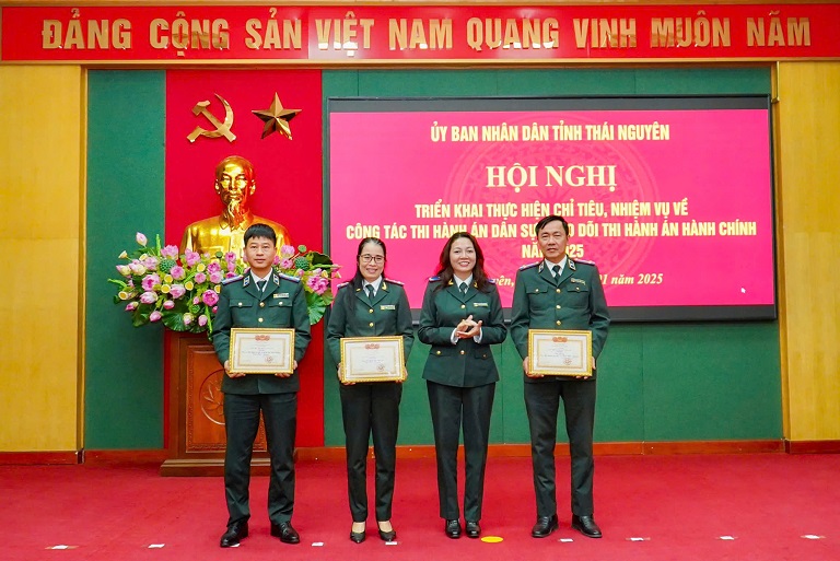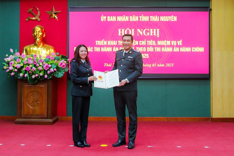 Nhân dịp này, Phó Tổng cục trưởng Trần Thị Phương Hoa thừa ủy quyền Bộ trưởng trao tặng Kỷ niệm chương “Vì sự nghiệp Tư pháp” cho 03 đồng chí; 08 Bằng khen của Bộ trưởng Bộ Tư pháp và 03 Danh hiệu “Tập thể lao động xuất sắc” cho các tập thể, cá nhân có thành tích xuất sắc, tiêu biểu trong công tác THADS năm 2024; Đồng chí Đặng Xuân Trường, Uỷ viên Ban Thường vụ Tỉnh uỷ, Phó Chủ tịch Thường trực UBND tỉnh, Trưởng Ban chỉ đạo THADS tỉnh Thái Nguyên trao tặng 09 Bằng khen của Chủ tịch UBND tỉnh cho các tập thể, cá nhân trong và ngoài Ngành. Đồng thời, tại Hội nghị thừa ủy quyền Bộ trưởng Bộ Tư pháp Phó Tổng cục trưởng Trần Thị Phương Hoa đã trao Quyết định bổ nhiệm ngạch Chấp hành viên cao cấp cho đồng chí Bùi Huy Toàn, Cục trưởng Cục THADS tỉnh Thái Nguyên./.