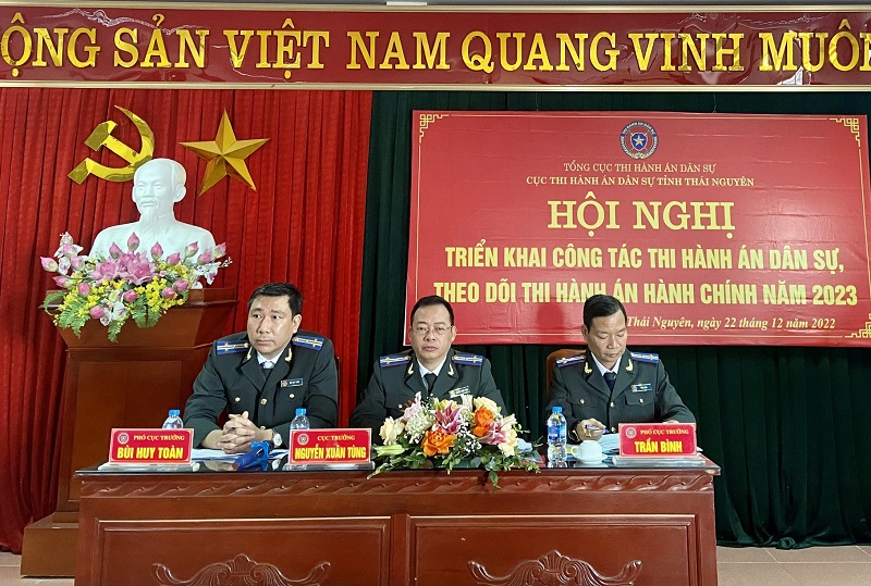 Sáng ngày 22/12/2022, Cục Thi hành án dân sự (THADS) tỉnh Thái Nguyên tổ chức Hội nghị triển khai công tác THADS, theo dõi thi hành án hành chính năm 2023. Dự và chỉ đạo Hội nghị có đồng chí Nguyễn Xuân Tùng, Cục trưởng Cục THADS tỉnh; tham dự Hội nghị có đại diện các ngành: Ban Nội chính Tỉnh ủy, Công an tỉnh, Viện Kiểm sát nhân dân tỉnh, Ban Pháp chế HĐND tỉnh, Trại giam Phú Sơn 4, Cục C10, Bộ Công an, Ngân hàng Nhà nước Chi nhánh tỉnh Thái Nguyên; các đồng chí lãnh đạo Cục, lãnh đạo các phòng thuộc Cục, lãnh đạo Chi cục THADS trực thuộc và các Chấp hành viên, Thẩm tra viên các cơ quan THADS tỉnh.