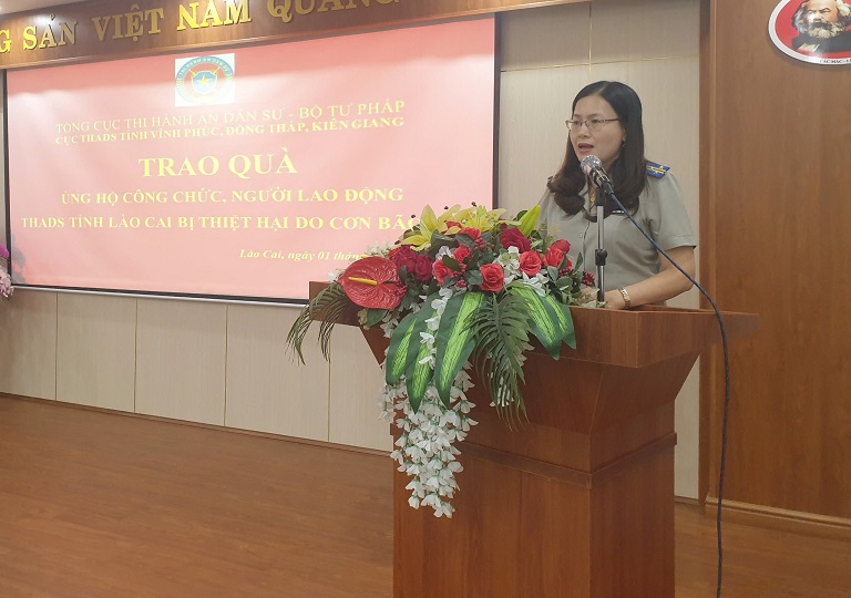 Trong trận bão lũ lịch sử vừa qua, Lào cai là một trong những địa phương bị thiệt hại nặng nề nhất về người và tài sản bởi tình trạng ngập lụt nghiêm trọng diện rộng. Trong đó có nhiều công chức, người lao động của Cục Thi hành án dân sự tỉnh Lào cai gặp nhiều khó khăn sau bão lũ. Tuy về giá trị vật chất không nhiều, nhưng hành động ủng hộ, động viên, thăm hỏi thể hiện tấm lòng sẻ chia của công chức, người lao động các cơ quan thi hành án dân sự tỉnh Vĩnh Phúc, tỉnh Đồng Tháp và tỉnh Kiên Giang, với mong muốn các đồng chí, đồng nghiệp bị thiệt hại do bão lũ khắc phục khó khăn, sớm ổn định cuộc sống để tiếp tục thực hiện hoàn thành các nhiệm vụ được giao.