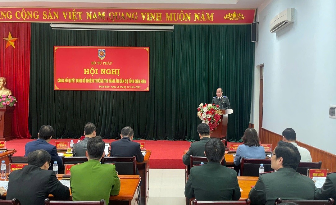 Chiều ngày 26/12/2025, tại trụ sở Thi hành án dân sự (THADS) tỉnh Điện Biên, Bộ Tư pháp phối hợp với UBND tỉnh Điện Biên tổ chức Hội nghị công bố Quyết định của Bộ trưởng Bộ Tư pháp về việc bổ nhiệm Trưởng THADS tỉnh Điện Biên. Dự Hội nghị về phía Cục Quản lý THADS - Bộ Tư pháp có đồng chí Nguyễn Thắng Lợi, Ủy viên Ban Chấp hành Đảng bộ Bộ Tư pháp, Bí thư Đảng ủy, Cục trưởng Cục Quản lý THADS; lãnh đạo, công chức Ban Tổ chức cán bộ, Cục Quản lý THADS. Về phía tỉnh Điện Biên có ông Nguyễn Minh Phú, Ủy viên Ban Chấp hành Đảng bộ tỉnh, Phó Chủ tịch UBND tỉnh, Trưởng Ban Chỉ đạo THADS tỉnh; các đồng chí lãnh đạo đại diện các Ban, sở, ngành của tỉnh Điện Biên.