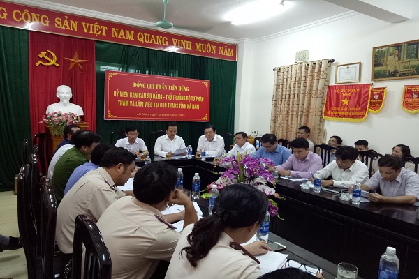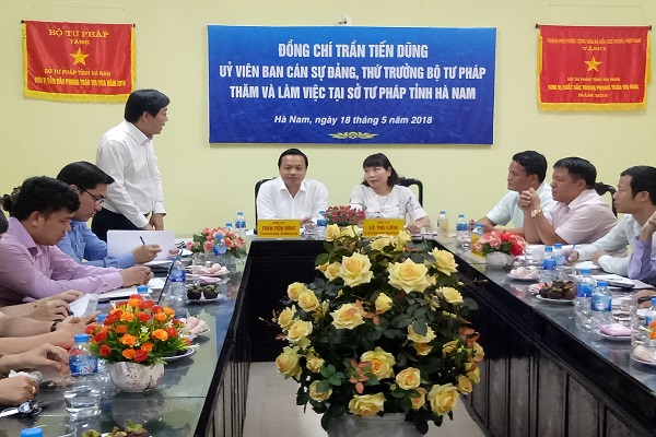 Buổi chiều cùng ngày, Thứ trưởng Trần Tiến Dũng và Đoàn công tác cũng đã làm việc với Sở Tư pháp tỉnh Hà Nam, trong đó Thứ trưởng đề cập và chỉ đạo nhiều nội dung liên quan đến công tác thi hành án dân sự, đặc biệt chú trọng thực hiện tốt mối quan hệ phối hợp của Sở Tư pháp trong công tác thi hành án dân sự.
