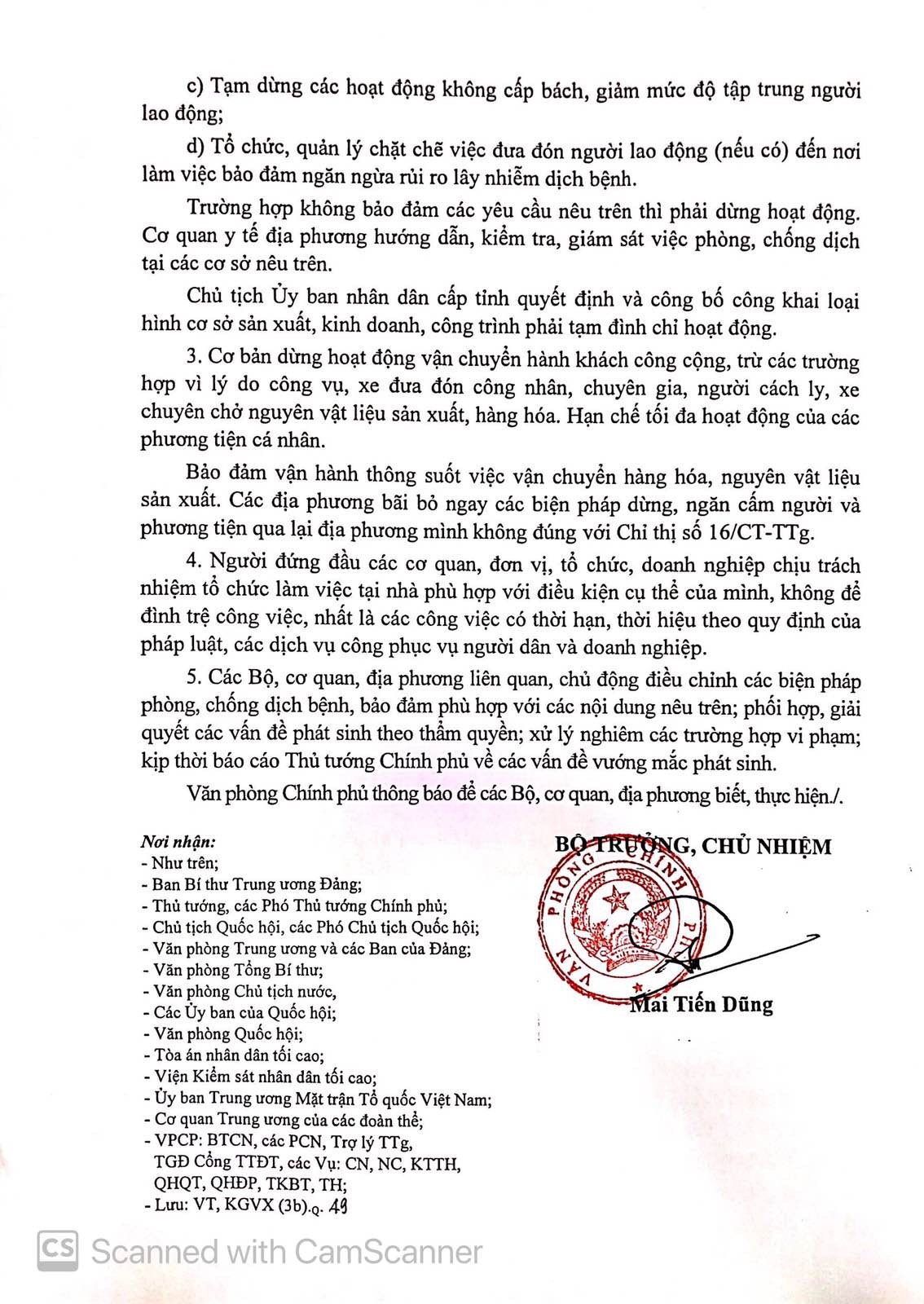 Bảo đảm vận hành thông suốt việc vận chuyển hàng hóa, nguyên vật liệu sản xuất. Các địa phương bãi bỏ ngay các biện pháp dừng, ngăn cấm người và phương tiện qua lại địa phương mình không đúng với Chỉ thị số 16/CT-TTg.