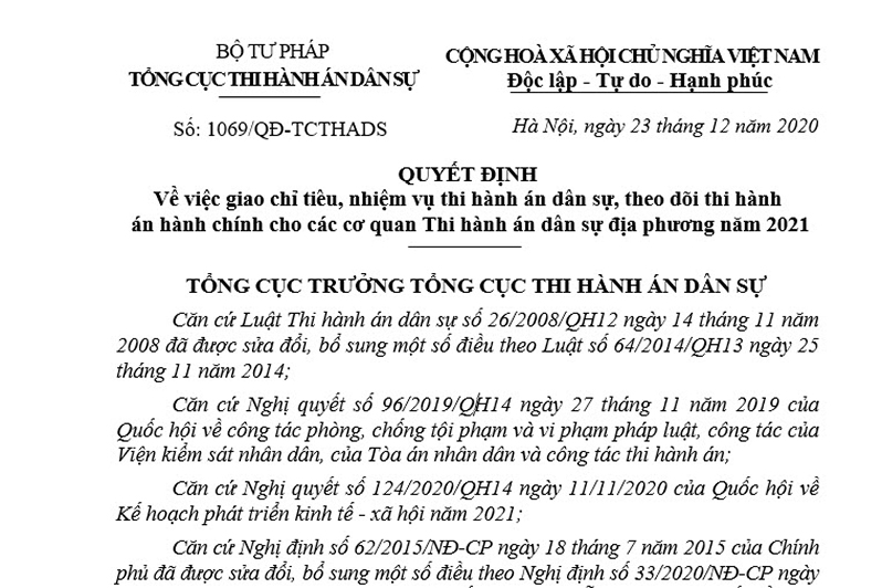 Ngày 23 tháng 12 năm 2020 Tổng Cục trưởng Tổng cục Thi hành án dân sự đã ban hành Quyết định số 1069/QĐ-TCTHADS về việc giao chỉ tiêu, nhiệm vụ thi hành án dân sự, theo dõi thi hành án hành chính cho các cơ quan Thi hành án dân sự địa phương năm 2021.