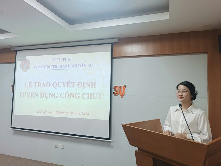 Phát biểu tại buổi Lễ, Tổng Cục trưởng Nguyễn Quang Thái nhiệt liệt chúc mừng 15 thí sinh trúng tuyển và đã có Quyết định tuyển dụng công chức. Tổng Cục trưởng mong muốn các công chức mới tiếp tục tìm hiểu về Hệ thống THADS và các đơn vị thuộc Bộ Tư pháp, tìm hiểu cách thức tiếp cận, xử lý công việc để thực hiện đúng theo quy định; luôn nỗ lực phấn đấu, tìm tòi, học hỏi kinh nghiệm thực tiễn để rèn luyện chính mình. Đối với các đơn vị, Tổng Cục trưởng yêu cầu phân công người hướng dẫn tập sự đối với các công chức mới để nhanh chóng bắt nhịp công việc. Đối với các tổ chức chính trị - xã hội thuộc Tổng cục THADS, Tổng Cục trưởng đề nghị các tổ chức chính trị - xã hội tạo điều kiện để các công chức mới hòa nhập, thể hiện sức trẻ rõ nét hơn nữa.
