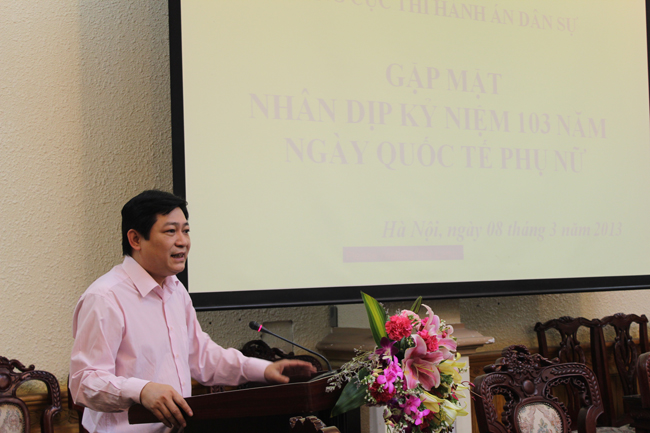 Thay mặt Đảng ủy, lãnh đạo Tổng cục, đồng chí Nguyễn Văn Sơn đã có bài phát biểu quan trọng ôn lại truyền thống 103 năm ngày Quốc tế phụ nữ 8/3 (1910 - 2013) và 1973 năm cuộc khởi nghĩa Hai Bà Trưng (40 - 2013) và chúc mừng toàn thể nữ cán bộ công chức của Tổng cục. Đồng chí khẳng định: nữ cán bộ công chức hiện nay đang chiếm đa số biên chế của Tổng cục cũng như toàn Ngành, được đào tạo cơ bản và có những thế hệ kế tiếp nhau để tiếp nối nhiệm vụ của Tổng cục, của Ngành. Tuy nhiên, trong quá trình quản lý, lãnh đạo, có những lúc Đảng ủy, Lãnh đạo Tổng cục, các cơ quan Thi hành án dân sự địa phương chưa coi trọng bình đẳng giới, vẫn có tư duy về sự ngang bằng trong công việc giữa nam - nữ, chưa cân nhắc những yếu tố giới trong phân công công việc. Công tác thi hành án dân sự với đặc thù là những việc vất vả, khó khăn, phức tạp, nhạy cảm; càng khó khăn hơn đối với các cán bộ công chức là nữ - những người vừa phải “giỏi việc nước, đảm việc nhà”. Mặc dù vậy, các nữ cán bộ công chức đều luôn cố gắng, nỗ lực; phát huy tối đa đặc tính giới của mình; hoàn thành những nhiệm vụ khó khăn, nhạy cảm như vận động, thuyết phục thi hành án, tiếp công dân... và đóng góp một phần đáng kể vào những thành tích của các cơ quan Thi hành án dân sự. Năm 2012, mặc dù gặp nhiều khó khăn do nền kinh tế suy giảm, số việc và tiền phải thi hành đều tăng, nhưng công tác thi hành án dân sự đã đạt được nhiều kết quả đáng khen ngợi (vượt 3,58% chỉ tiêu được giao về việc và 6,97% chỉ tiêu được giao về tiền). Công tác tham mưu, xây dựng thể chế; hướng dẫn nghiệp vụ; giải quyết khiếu nại tố cáo; tổ chức cán bộ; kế hoạch tài chính; văn phòng ... đều đạt được những kết quả nhất định. Những kết quả nêu trên một phần không nhỏ là nhờ sự tích cực hoạt động của Ban Nữ công, Ban Vì sự tiến bộ phụ nữ cơ quan Thi hành án dân sự với những nội dung thiết thực nhằm thực hiện tốt các phong trào “Giỏi việc nước, đảm việc nhà”, “Phụ nữ tích cực học tập, lao động sáng tạo xây dựng gia đình hạnh phúc”; nhờ việc phát huy khả năng, trí tuệ; nỗ lực khắc phục mọi khó khăn vất vả trong việc chăm lo gia đình để chu toàn việc nước của các đồng chí nữ cán bộ công chức trong toàn cơ quan Thi hành án dân sự nói chung và Tổng cục nói riêng. Đảng ủy, Lãnh đạo Tổng cục nhiệt liệt biểu dương và cảm ơn những nỗ lực, cố gắng của các đồng chí.