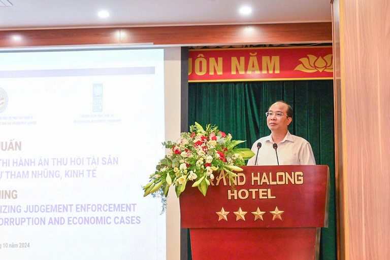 Trong các ngày 18, 22 và 25/10/2024, Tổng cục Thi hành án dân sự - Bộ Tư pháp đã phối hợp với Chương trình phát triển của Liên hợp quốc (UNDP) và Cơ quan Phòng chống ma túy và thực thi pháp luật quốc tế (INL) tổ chức 03 Lớp tập huấn “Sổ tay hướng dẫn kỹ năng, nghiệp vụ thu hồi tài sản bị thất thoát, chiếm đoạt trong các vụ án hình sự về tham nhũng, kinh tế” trên phạm vi toàn quốc.