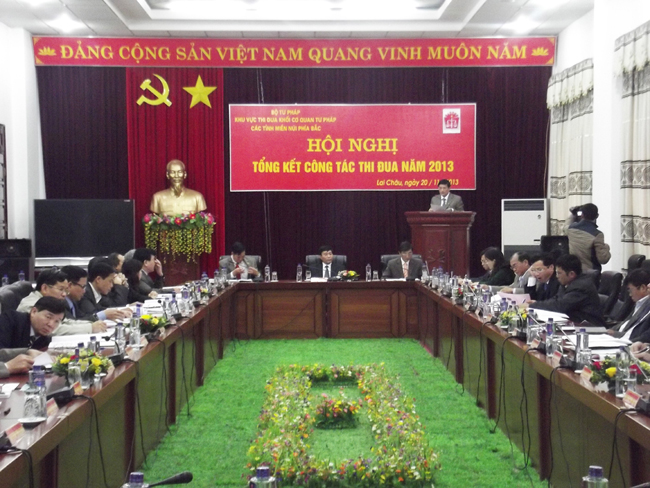 Thay mặt các cơ quan Tư pháp khu vực Miền núi phía Bắc, Đồng chí Nguyễn Quang Tản - Giám đốc Sở Tư pháp tỉnh Lai Châu, Trưởng Khu vực thi đua đã báo cáo kết quả thực hiện nhiệm vụ công tác năm 2013 của các cơ quan Tư pháp các tỉnh Miền núi phía Bắc. Báo cáo đã khẳng định những kết quả đạt được trong việc thực hiện các phong trào thi đua “Toàn ngành Tư pháp tập trung củng cố, kiện toàn tổ chức cán bộ, đổi mới lề lối làm việc, đoàn kết, sáng tạo, kỷ cương trách nhiệm, hoàn thành xuất sắc nhiệm vụ chính trị được giao”, tạo không khí thi đua sôi nổi trong toàn thể cán bộ công chức, viên chức và người lao động toàn ngành; phát huy tính chủ động, tích cực, sáng tạo của mỗi cá nhân, tập thể, phấn đấu hoàn thành xuất sắc nhiệm vụ được giao. Năm 2013, một số lĩnh vực đã đạt được kết quả đáng ghi nhận như việc giúp Ủy ban nhân dân tỉnh tổ chức triển khai thực hiện Kế hoạch lấy ý kiến nhân dân đối với Dự thảo sửa đổi Hiến pháp năm 1992; Công tác xây dựng, thẩm định văn bản quy phạm pháp luật; hành chính Tư pháp; công tác Thi hành án dân sự tiếp tục đạt được kết quả ổn định và bền vững, số việc và tiền thi hành xong cao hơn năm 2012 và những năm trước đây; tỷ lệ việc, tiền có điều kiện tăng cao; việc xây dựng, bồi dưỡng, nhân rộng gương điển hình tiên tiến tiếp tục được quan tâm thực hiện... Bên cạnh đó, các phong trào thi đua “Tiếp tục đẩy mạnh việc học tập và làm theo tấm gương đạo đức Hồ Chí Minh”, phong trào “ngành Tư pháp chung sức góp phần xây dựng nông thôn mới” cũng đã đạt được những kết quả tích cực, góp phần vào việc thực hiện thắng lợi kế hoạch phát triển kinh tế - xã hội của đất nước và địa phương.