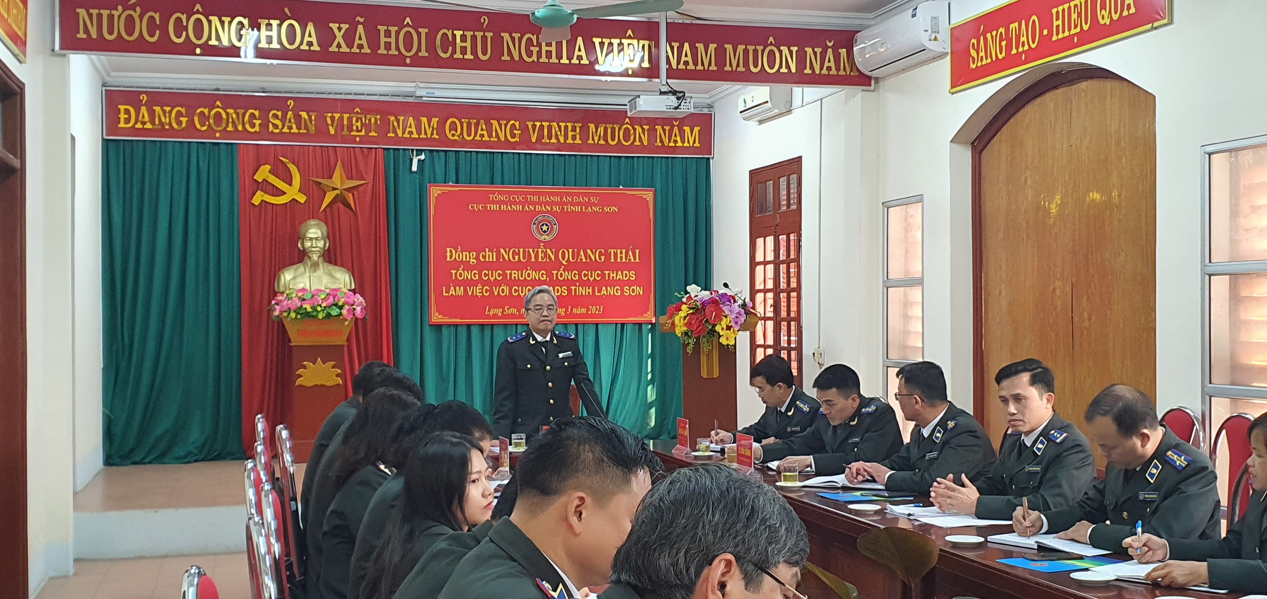 Ngày 02/3/2023, Đoàn công tác của Tổng cục THADS do đồng chí Tổng Cục trưởng Nguyễn Quang Thái đã làm việc với Cục Thi hành án dân sự tỉnh Lạng Sơn. Tham dự buổi làm việc có các đồng chí lãnh đạo Văn phòng Tổng cục, lãnh đạo Vụ Tổ chức cán bộ, lãnh đạo các Vụ Nghiệp vụ, tập thể Lãnh đạo Cục THADS tỉnh Lạng Sơn, lãnh đạo các Phòng chuyên môn, lãnh đạo Chi cục THADS các huyện, thành phố.