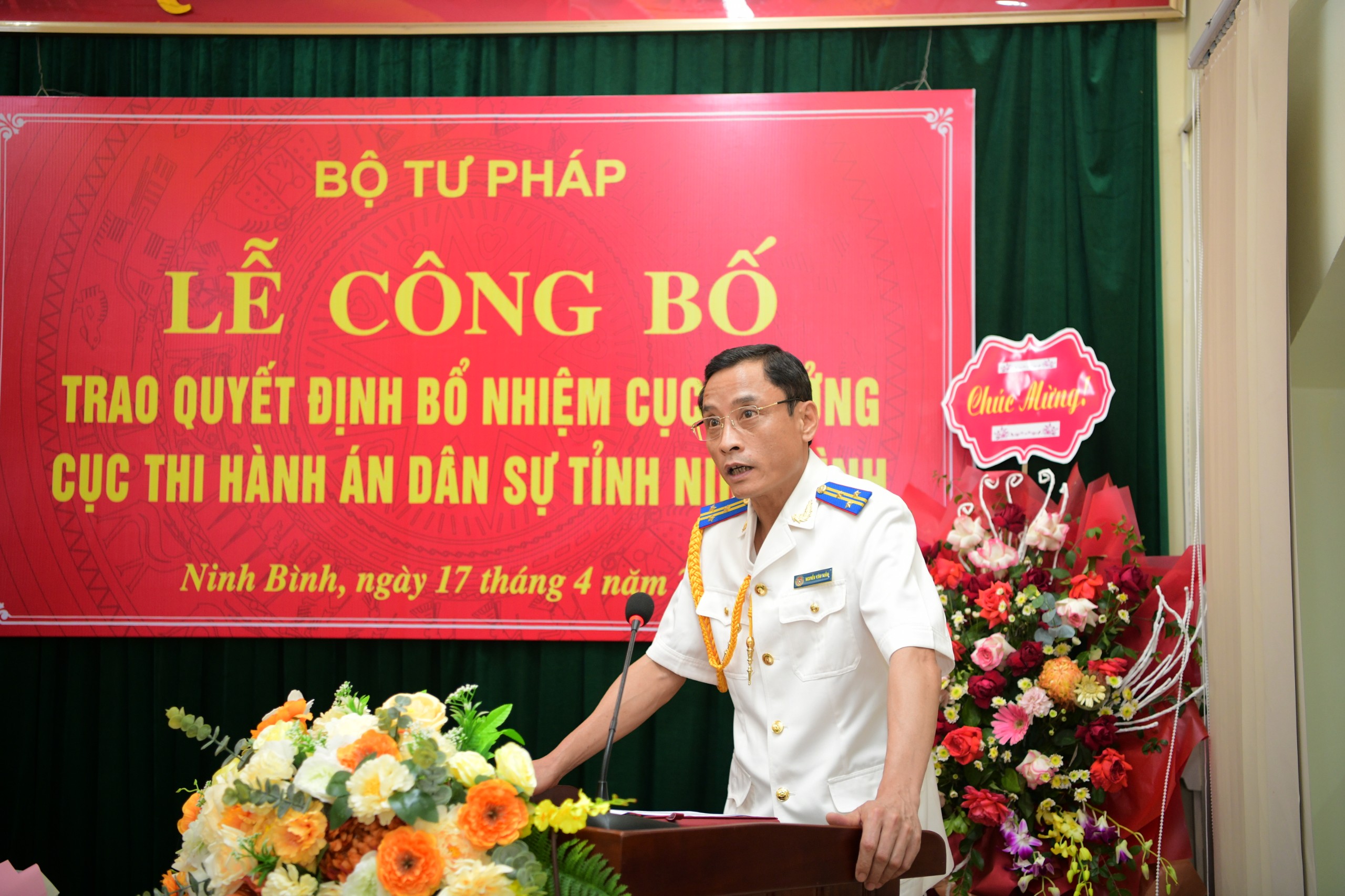 Tại buổi lễ, đồng chí Nguyễn Văn Sơn, Phó Tổng cục trưởng Tổng cục Thi hành án dân sự Bộ Tư pháp thay mặt Lãnh đạo Bộ, Lãnh đạo Tổng cục Thi hành án dân sự trao Quyết định số 579/QĐ-BTP ngày 05/4/2024 của Bộ trưởng Bộ Tư pháp về việc bổ nhiệm công chức lãnh đạo đối với đồng chí Nguyễn Văn Tuấn, Phó Cục trưởng phụ trách Cục Thi hành án dân sự tỉnh Ninh Bình giữ chức Cục trưởng Cục Thi hành án dân sự tỉnh Ninh Bình từ ngày 10/4/2024 (thời hạn 5 năm kể từ ngày được bổ nhiệm); Đồng thời phát biểu ghi nhận, đánh giá cao sự nỗ lực và những kết quả đạt được đồng chí Nguyễn Văn Tuấn trong thời gian là Phó Cục trưởng phụ trách Cục THADS tỉnh Ninh Bình. Bên cạnh đó, đề nghị đồng chí Nguyễn Văn Tuấn trên cương vị mới tiếp tục phát huy hơn nữa những thành tích đạt được, đánh giá đúng tình hình, bối cảnh địa phương và những yêu cầu đặt ra của Đảng, Nhà nước, ngành để cùng tập thể lãnh đạo Cục Thi hành án dân sự tỉnh Ninh Bình đoàn kết, thống nhất chỉ đạo đề ra các giải pháp phù hợp, bảo đảm công tác THADS trên địa bàn tỉnh Ninh Bình ngày càng tốt hơn, nỗ lực hoàn thành tốt nhiệm vụ được giao. Cũng nhân dịp này, đồng chí Nguyễn Văn Sơn gửi lời cảm ơn sự quan tâm của Tỉnh ủy, Ủy ban nhân dân; các sở, ban, ngành của tỉnh Ninh Bình đã quan tâm chỉ đạo, phối hợp chặt chẽ với cơ quan Thi hành án dân sự tỉnh Ninh Bình trong suốt thời gian qua.