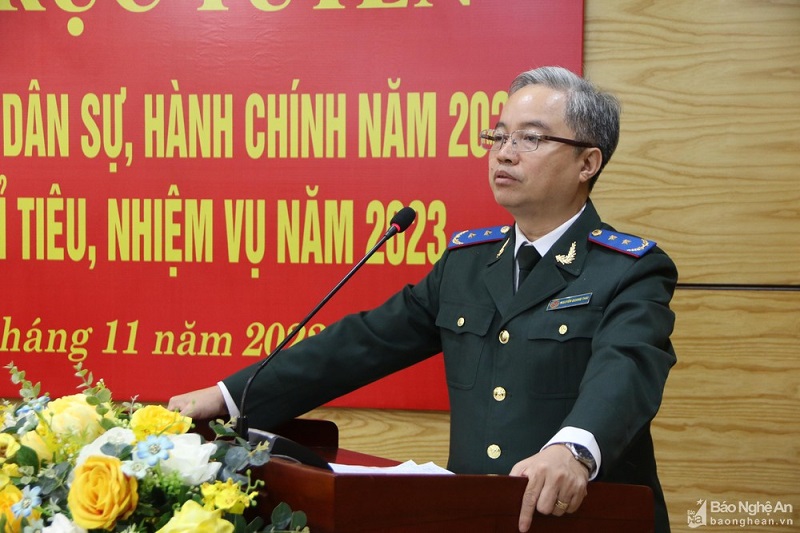 Bên cạnh đó, đồng chí cũng đề nghị Cục THADS tỉnh thẳng thắn nhìn nhận những tồn tại, hạn chế còn gặp phải trong năm 2022 từ đó nghiêm túc khắc phục để thực hiện tốt hơn các nhiệm vụ, chỉ tiêu được giao trong năm 2023 và những năm tiếp theo. Trong bối cảnh dự báo năm 2023 kinh tế xã hội tiếp tục được phục hồi, dự báo số lượng việc tiền phải thi hành án của cả nước và Nghệ An tiếp tục tăng cao, yêu cầu nhiệm vụ về công tác THADS, HC sẽ tiếp tục gặp nhiều khó khăn, thách thức trong thời gian tới. Do vậy, đồng chí Nguyễn Quang Thái – Tổng cục trưởng đề nghị các cơ quan THADS trên địa bàn tỉnh Nghệ An cần tiếp tục nhận thức sâu sắc hơn nữa các chỉ đạo của Trung ương, cấp ủy, chính quyền địa phương về yêu cầu nhiệm vụ, đề ra các giải pháp có trọng tâm, trọng điểm, trước mắt và lâu dài trong bối cảnh thích ứng an toàn, linh hoạt, kiểm soát hiệu quả dịch COVID-19 trong điều kiện bình thường mới để phấn đấu hoàn thành các chỉ tiêu, nhiệm vụ được giao.