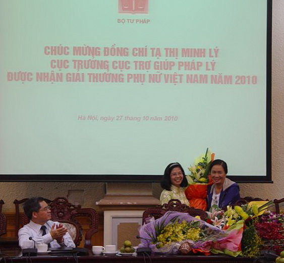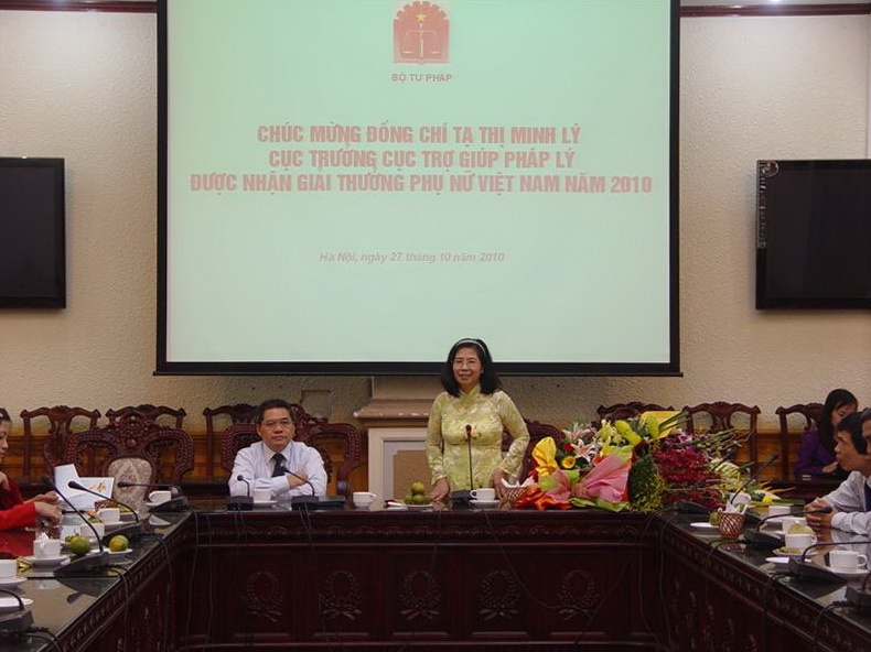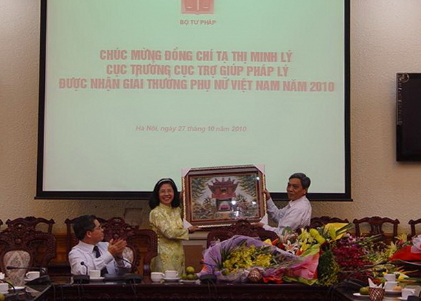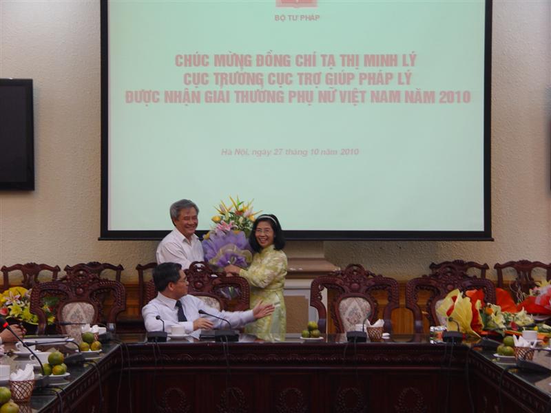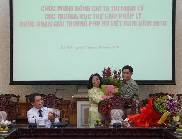Thứ trưởng Đinh Trung Tụng, các đồng chí là Ủy viên Ban Thường vụ Đảng ủy, đại diện các tổ chức chính trị - xã hội trong cơ quan Bộ, các đồng chí lãnh đạo các đơn vị thuộc Bộ cùng đông đảo cán bộ công chức của Cục Trợ giúp pháp lý đã đến dự buổi gặp mặt và chúc mừng đồng chí Tạ Thị Minh Lý – người phụ nữ Việt Nam năm 2010 của ngành Tư pháp chúng ta. Thay mặt Ban Cán sự Đảng, lãnh đạo và Đảng ủy cơ quan Bộ Tư pháp, Thứ trưởng Đinh Trung Tụng đã nhiệt liệt biểu dương sự nỗ lực phấn đấu không ngừng trong thời gian qua của chị Lý; đồng thời khẳng định: giải thưởng của chị không chỉ là vinh quang cá nhân mà còn là niềm vinh dự của toàn ngành Tư pháp nói chung, của Bộ Tư pháp nói riêng.