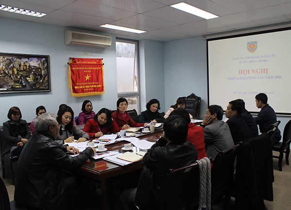 Nhằm thực hiện hiệu quả Chương trình công tác trọng tâm năm 2016 của hệ thống thi hành án dân sự và Kế hoạch công tác năm 2016 của Tổng cục Thi hành án dân sự; được sự nhất trí của Lãnh đạo Tổng cục Thi hành án dân sự, chiều ngày 27/01/2016, Vụ Tổ chức cán bộ Tổng cục Thi hành án dân sự tổ chức triển khai công tác năm 2016. Tham dự và chỉ đạo Hội nghị có đồng chí Tổng cục trưởng Hoàng Sỹ Thành và đồng chí Phó Tổng cục trưởng Mai Lương Khôi, đồng chí Trần Quốc Huy- Phó Trưởng phòng công tác cán bộ-Vụ Tổ chức cán bộ Bộ Tư pháp, đồng chí Võ Thu Ba, đại diện Lãnh đạo Văn phòng Tổng cục, cùng tập thể lãnh đạo Vụ và toàn thể công chức của Vụ Tổ chức cán bộ.