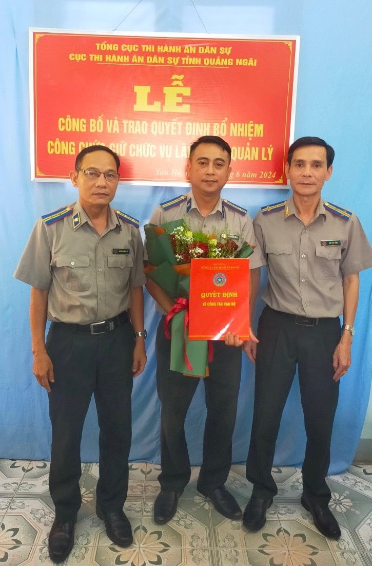 Đồng thời, trước đó, vào ngày 24/6/2024, Cục THADS Quảng Ngãi cũng đã tổ chức lễ công bố Quyết định số 115/QĐ-CTHADS ngày 21/6/2024 bổ nhiệm ông Phạm Nhất Duy, Chấp hành viên sơ cấp Chi cục THADS huyện Bình Sơn giữ chức vụ Phó Chi cục trưởng Chi cục THADS huyện Bình Sơn, trong thời hạn 05 năm, kể từ ngày 01/7/2024./.
