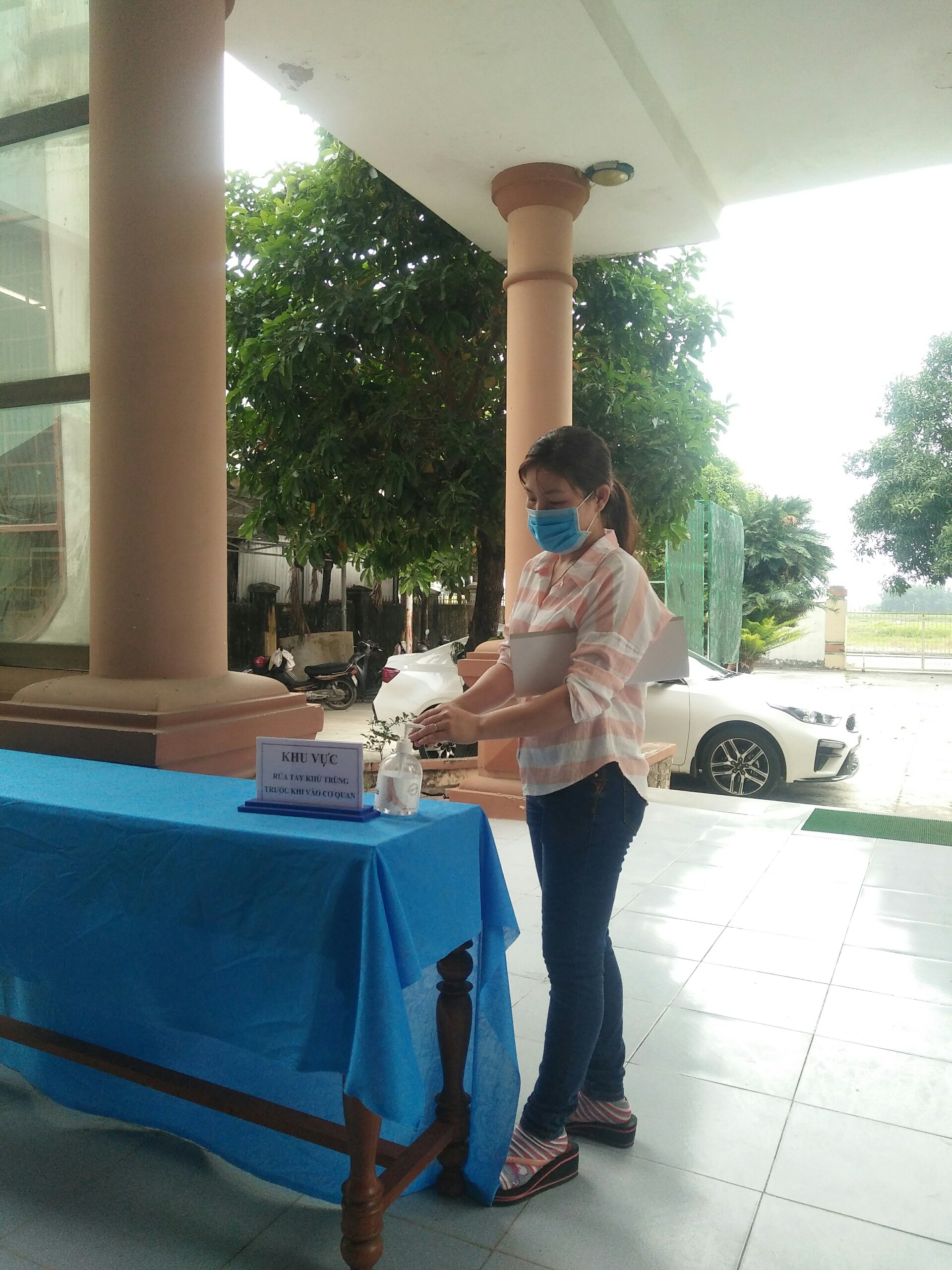 (Hình ảnh đoàn viên chi đoàn dọn dẹp vệ sinh cơ quan, phòng làm việc, khu vực bố trí nước sát khuẩn trước khi vào cơ quan làm việc)